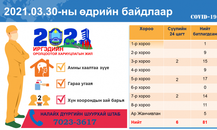 Налайх дүүрэгт сүүлийн 24 цагт шинээр 6 тохиолдол бүртгэгдлээ