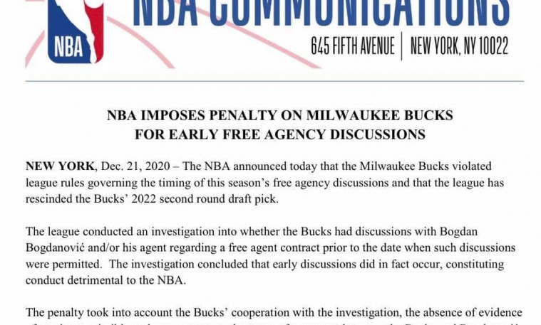 NBA-ээс Милуоки Баксыг торгож, 2022 оны драфтын 2-р тойргийн эрхийг нь хурааж авлаа. Мөн Богдан Богдановичтой зөвшөөрсөн хугацаанаас өмнө холбоо тогтоож багтаа элсүүлэх оролдлогыг хийсэн нь тогтоогдсон байна. Тиймээс л Богдан, Бакс хоёр яриагаа бүрмөсөн больсон байжээ.