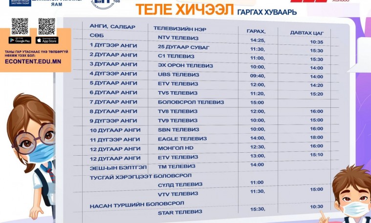 БШУЯ-аас бэлтгэсэн Теле хичээл Монголын телевизүүдийн холбооны 17 телевизээр ажлын өдрүүдэд гарч байна. Мөн Монголын үндэсний олон нийтийн телевизийн Нэгдүгээр суваг, Монголын мэдээ, “MNB спорт”, “MNB гэр бүл” сувгуудаар давтан гаргаж байна. Эцэг, эх, төгсөх анги