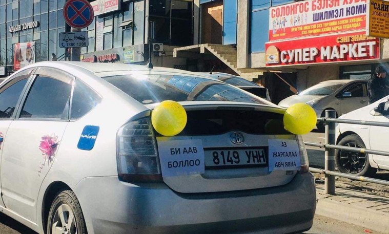 "АЗ ЖАРГАЛАА АВЧ ЯВНА" үгээр машинаа гоёсон аав