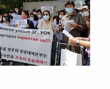 БНСУ-аас эх орон руугаа буцаж чадахгүй байгаа Монгол иргэд Солонгосын Гадаад Хэргийн Яамны гадна талбайд тайван жагсаал хийж байна. Жагсаалын шалтгаан нь Монгол Улсын Засгийн газар, УОК-оос ямар нэгэн албан хариу өгөөгүй, хэзээ буцахаа мэдэхгүй байгаа иргэд ийнхүү жагсахад хүрчээ. Жагсагчдын ихэнх