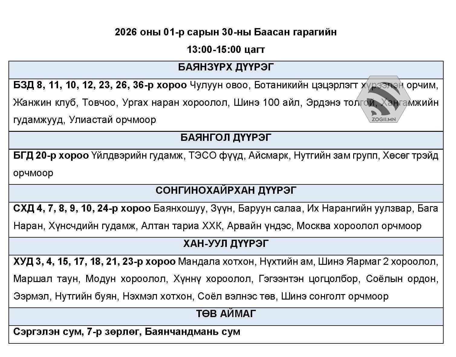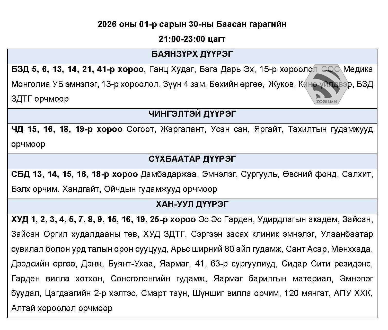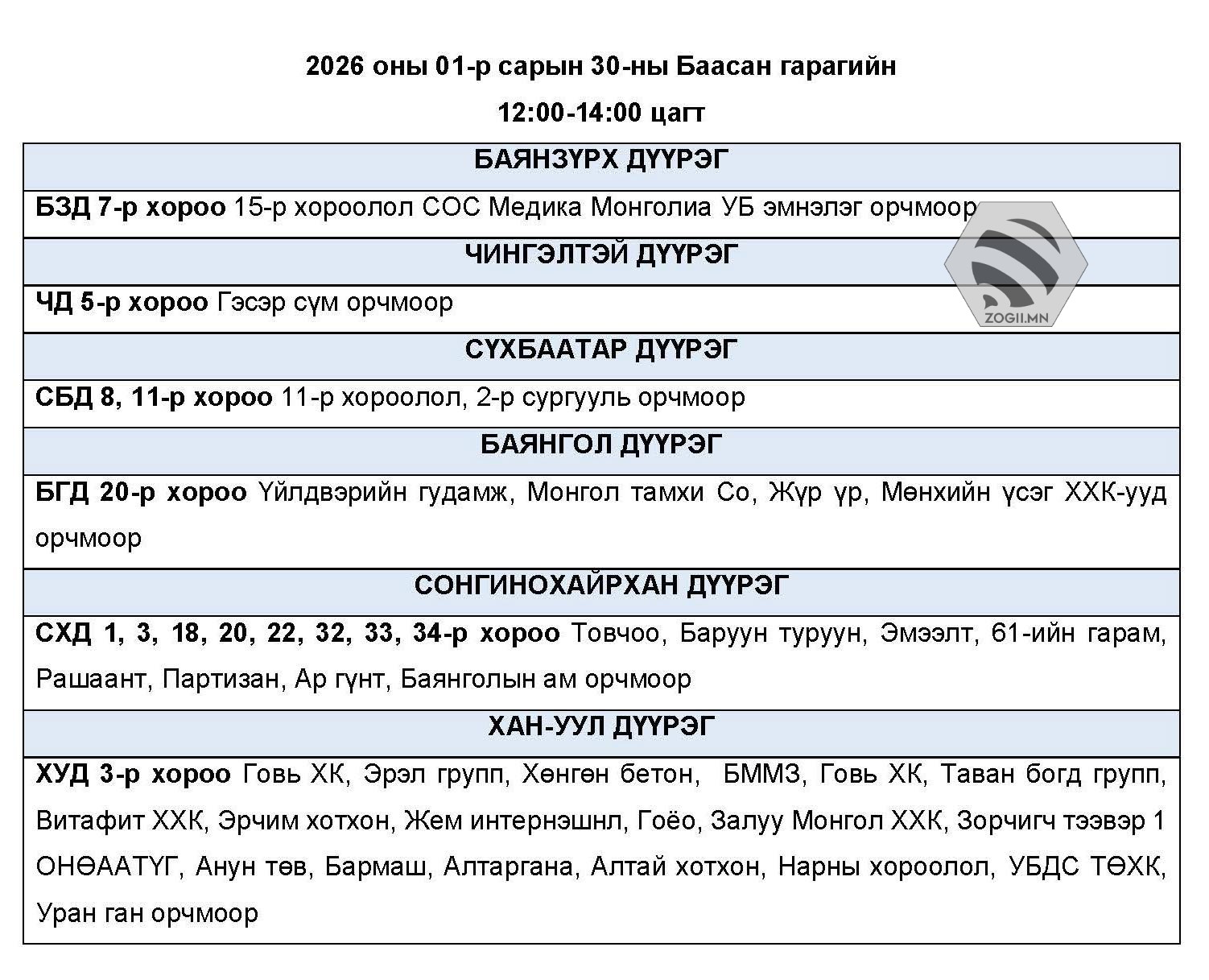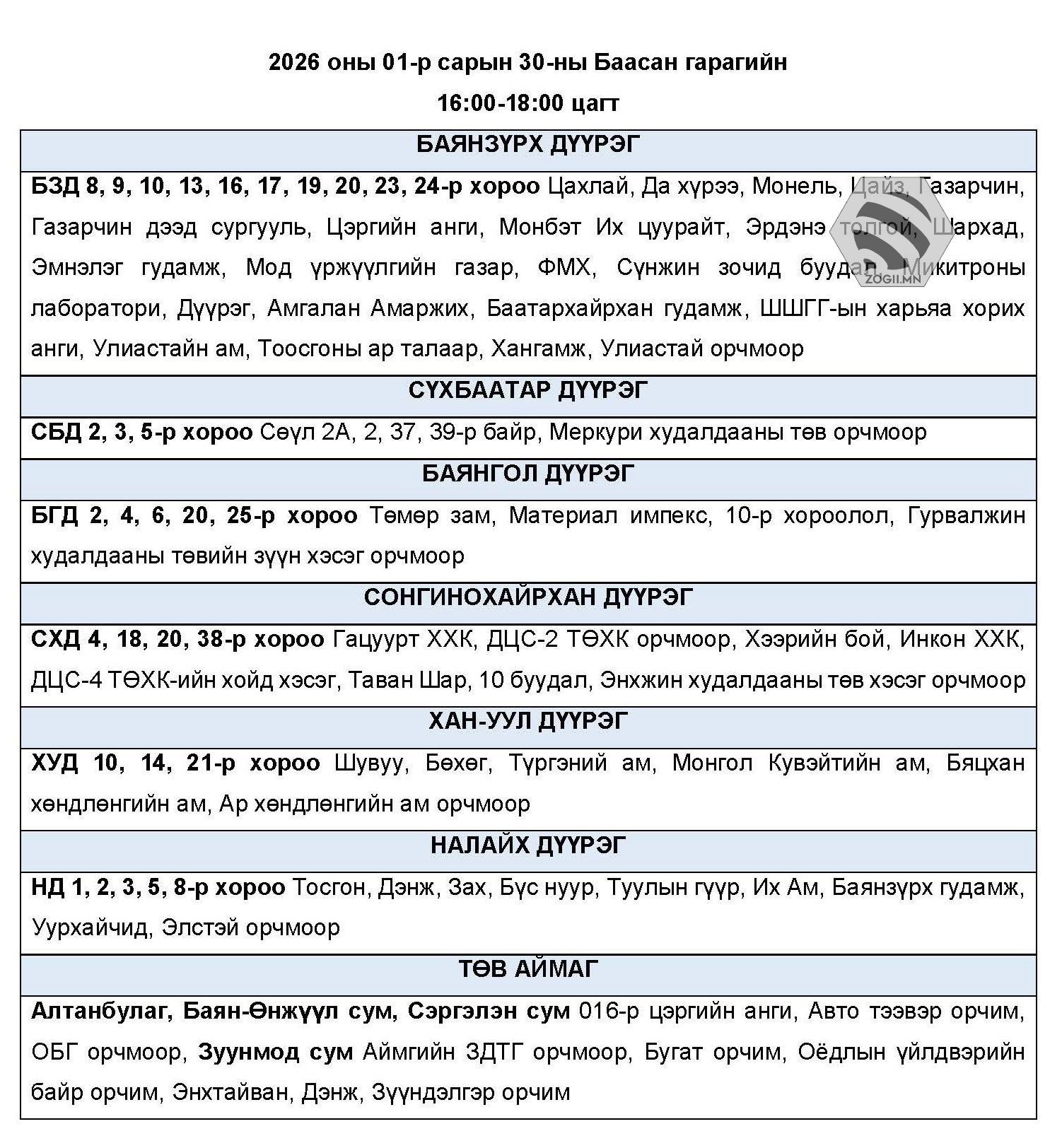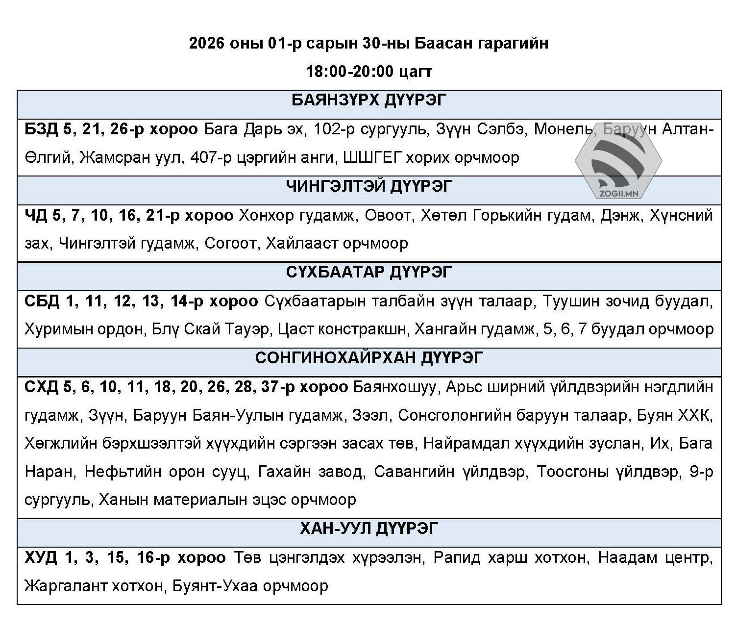 “Диспетчерийн үндэсний төв” ТӨХХК-ийн шийдвэрийн дагуу 2026 оны 01 дүгээр сарын 30-ны Баасан гарагт цахилгааны хязгаарлалтыг хуваарийн дагуу 2 цагийн хугацаатай хэрэгжүүлэх юм.