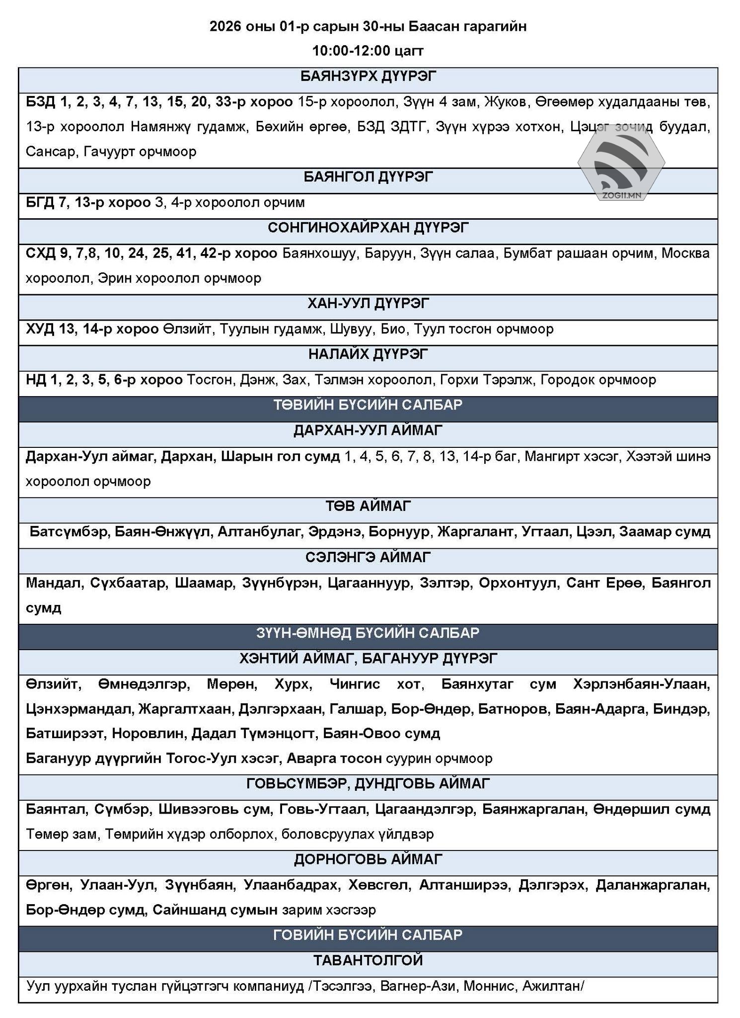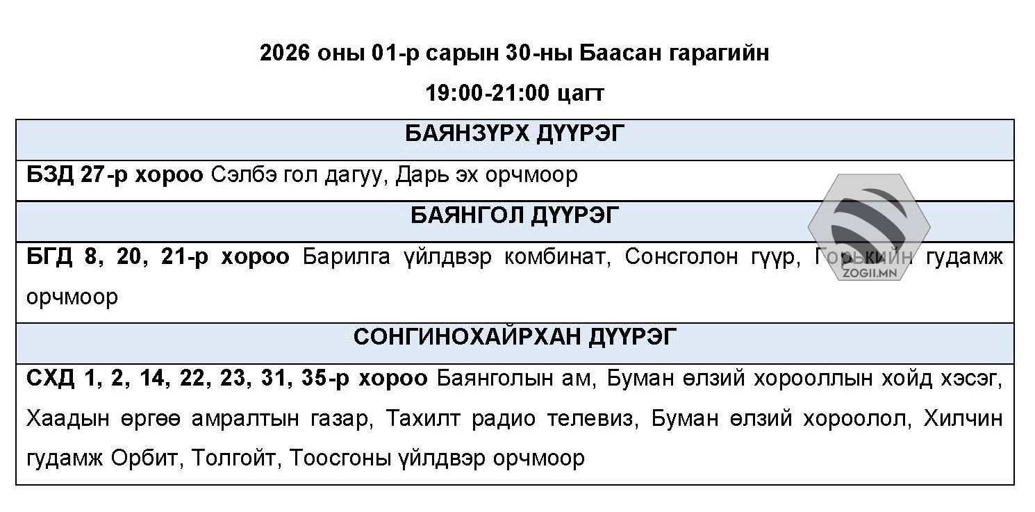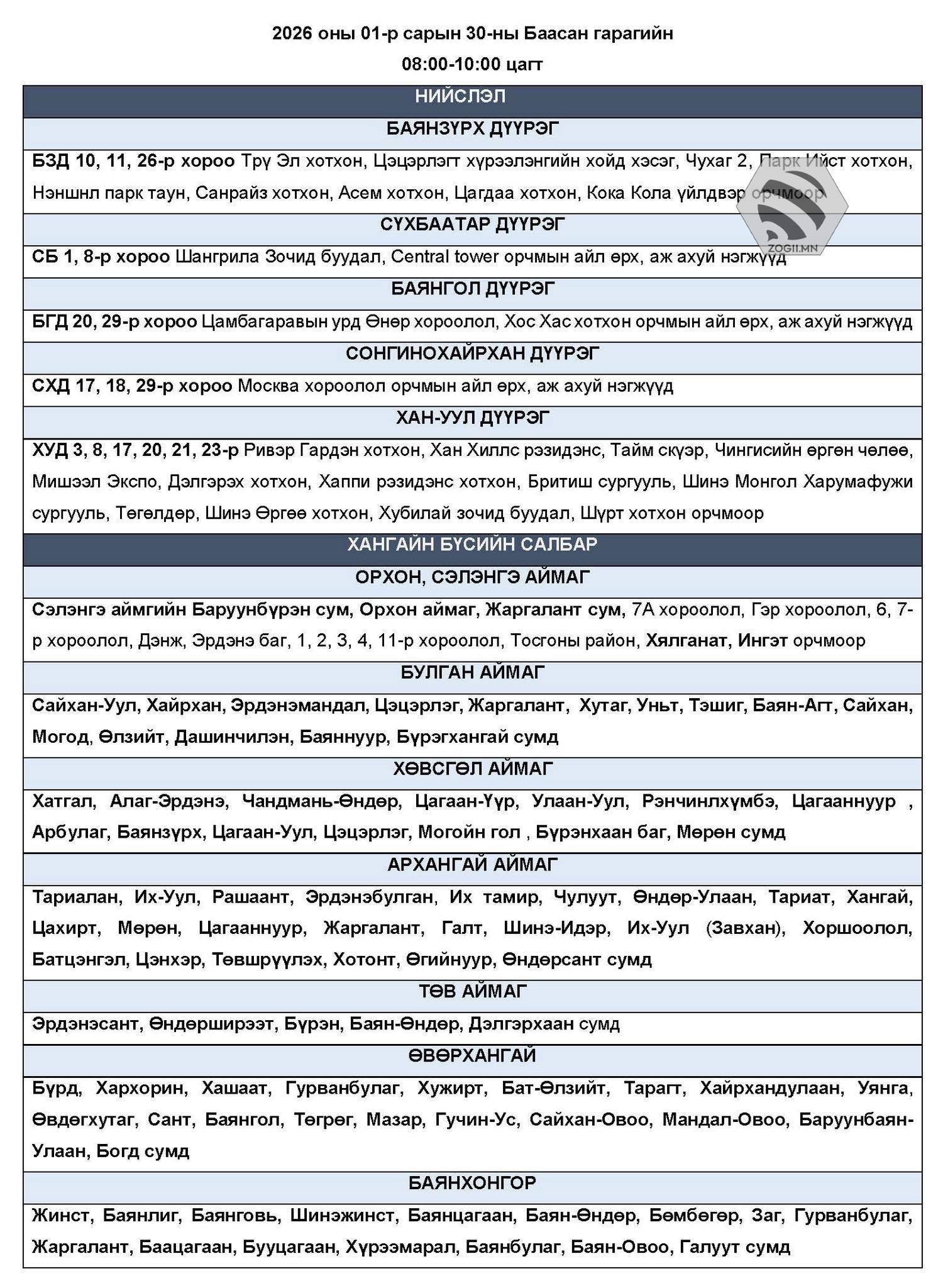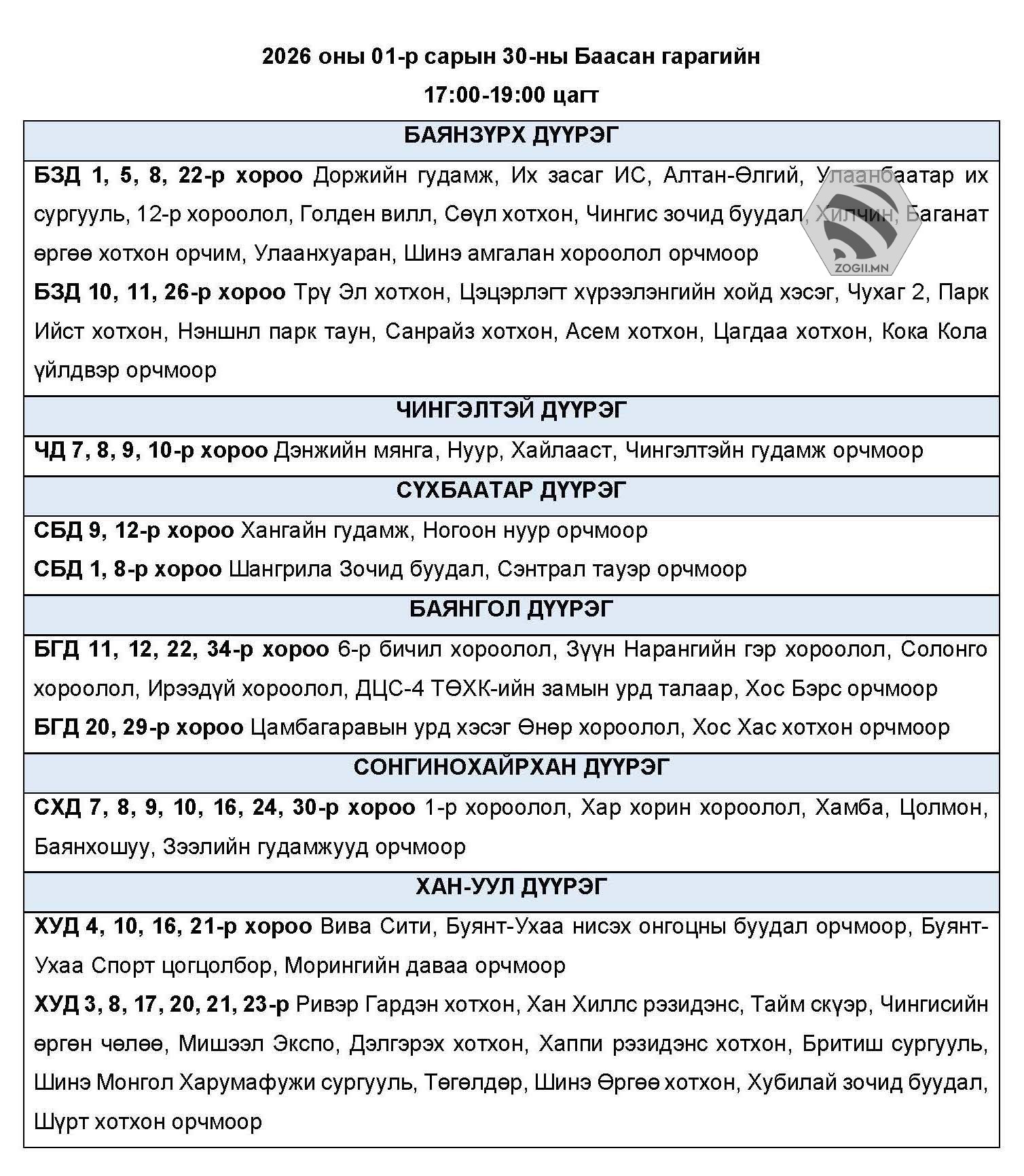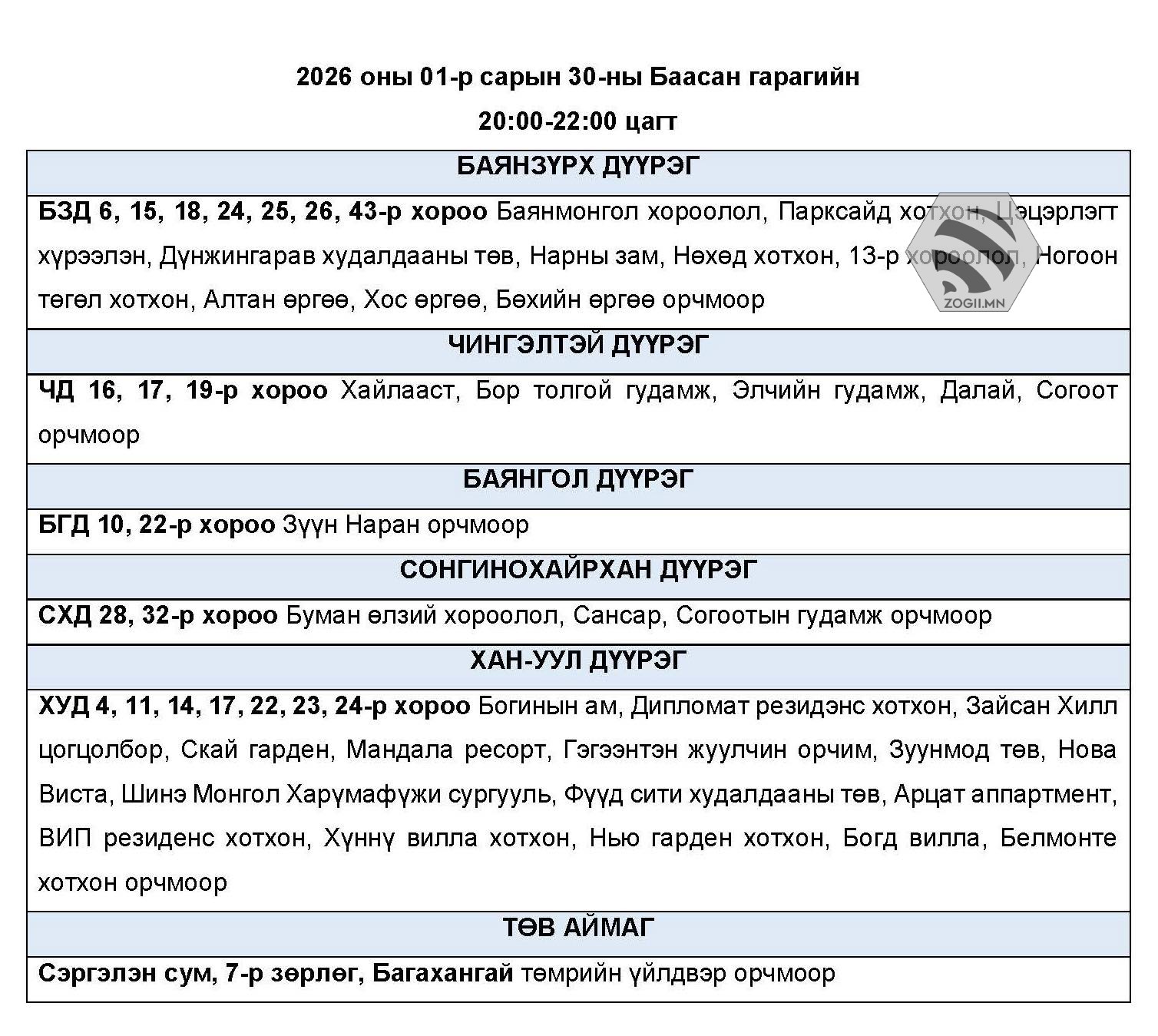 “Диспетчерийн үндэсний төв” ТӨХХК-ийн шийдвэрийн дагуу 2026 оны 01 дүгээр сарын 30-ны Баасан гарагт цахилгааны хязгаарлалтыг хуваарийн дагуу 2 цагийн хугацаатай хэрэгжүүлэх юм.