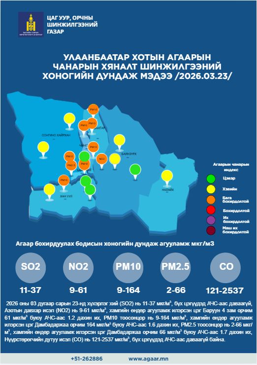 Улаанбаатар хотйн агаарын чанарын хяналт шинжилгээний хоногийн мэдээгээр 2026 оны 03 дугаар сарын 23-ны өдөр