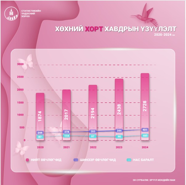 Эрүүл Мэндийн Яамны мэдээлснээр 2024 оны байдлаар улсын хэмжээнд хөхний хорт хавдраар 2728 хүн оношлогдсоноос 401 нь шинээр оношлогджээ. Сүүлийн таван жилд хөхний хорт хавдраар 495 хүн нас барсан байна. Дэлхий нийтээр жил бүрийн аравдугаар сарыг хөхний хорт хавдрын эсрэг дуу хоолойгоо нэгтгэх, хөхний хавдрын талаар мэдлэг ойлголтыг нэмэгдүүлэх, эрт илрүүлгийн ач холбогдлыг таниулах мөн хөхний хорт хавдрын эсрэг тэмцэж буй даван туулагчдын итгэл найдвар, хүч чадлыг онцлон тэмдэглэх онцгой сар болгон тэмдэглэдэг уламжлалтай билээ.