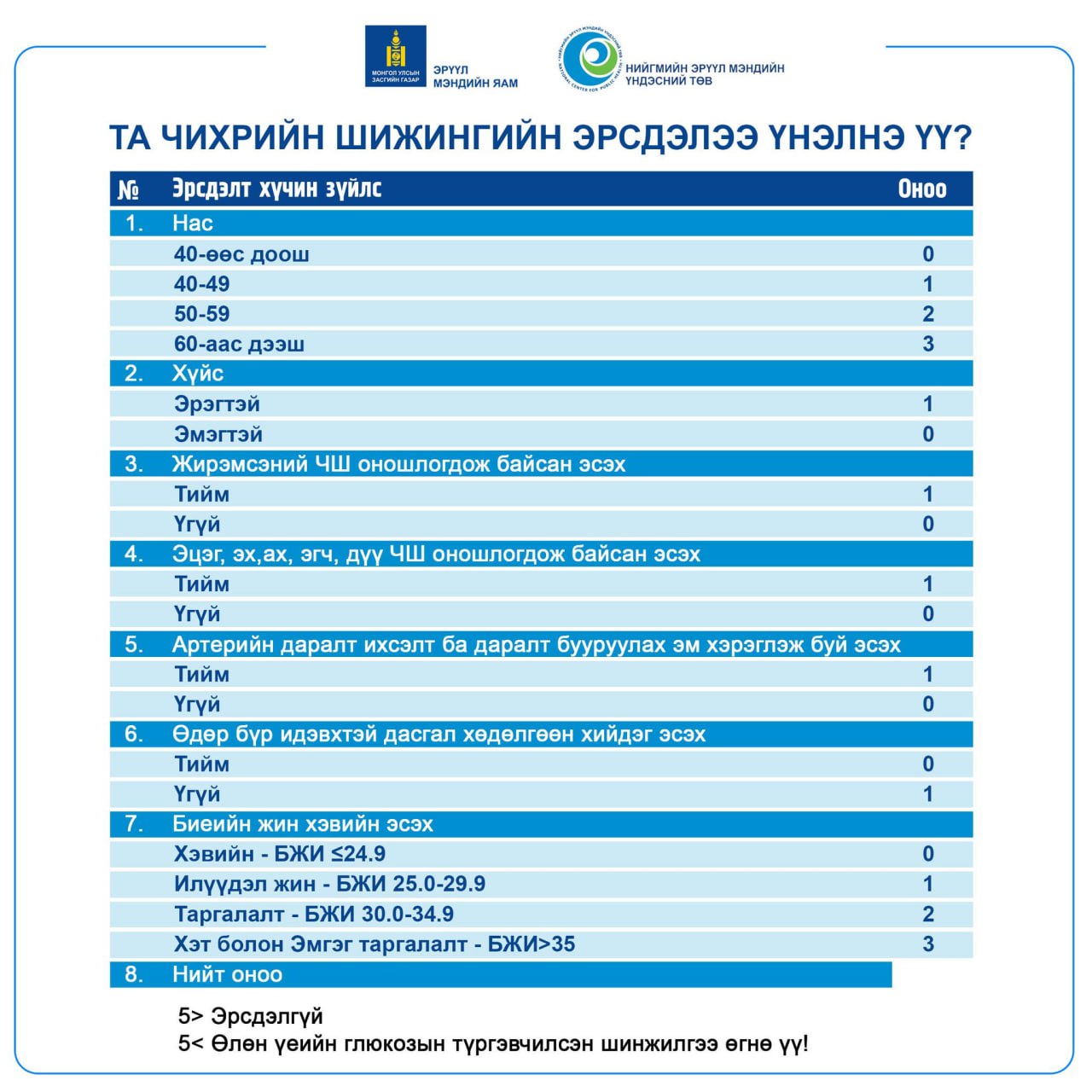 - ≥ 5 бол — Харьяа эрүүл мэндийн төвдөө хандах, эрүүл амьдралын хэв маягт суралцах, дадуулах арга хэмжээг авч хэрэгжүүлээрэй.