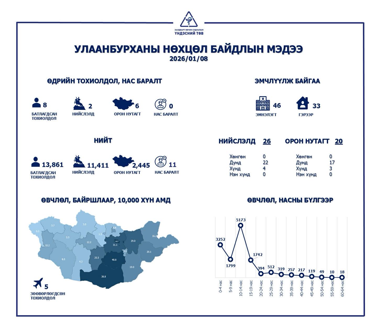 2026 оны нэгдүгээр сарын 08-ны өдрийн байдлаар улаанбурхан өвчний лабораториор батлагдсан тохиолдол 13.861 боллоо. Үүнээс: