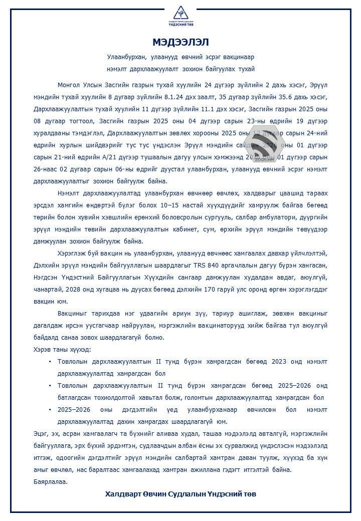 Улаанбурхан өвчин нь халдварлалт өндөртэй ч вакцинаар сэргийлэгдэх боломжтой халдварт өвчин юм. Улаанбурхан өвчний эсрэг вакцинд хамрагдсан тухай мэдээллээ өрх, сумын эрүүл мэндийн төвдөө очин цахим бүртгэлийн программд бүртгүүлээрэй. Хэрвээ улаанбурханы эсрэг вакцинд хамрагдаагүй хоцорсон бол хамрагдан өөрийгөө болон бусдыг улаанбурхан өвчнөөс хамгаалаарай.