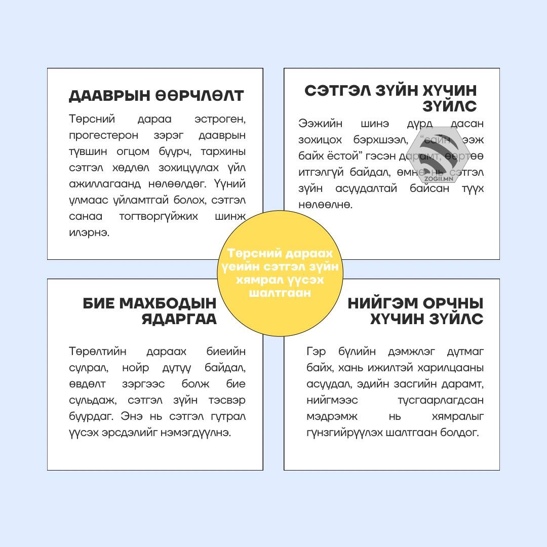Төрсний дараа 2–3 дахь хоногоос эхлэн бие махбод дааврын огцом өөрчлөлтийн улмаас эхчүүдэд сэтгэл санааны тогтворгүй байдал илрэхийг төрсний дараах сэтгэл хямрал гэж нэрлэдэг. Ихэвчлэн 10–14 хоногийн дотор аяндаа намжиж, дааврын түвшин тогтворжихын хэрээр сэтгэл зүй хэвийн байдалдаа ордог.