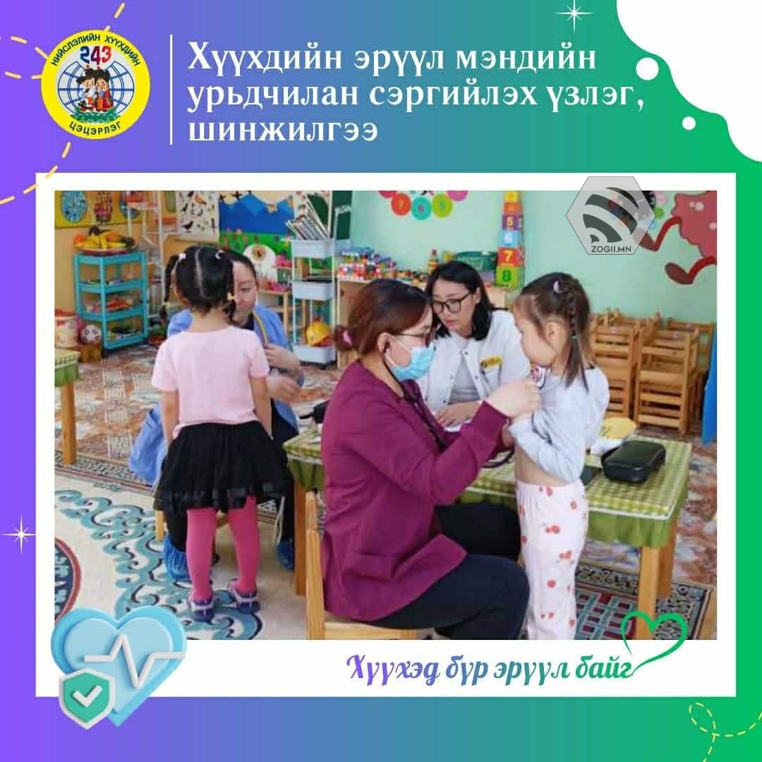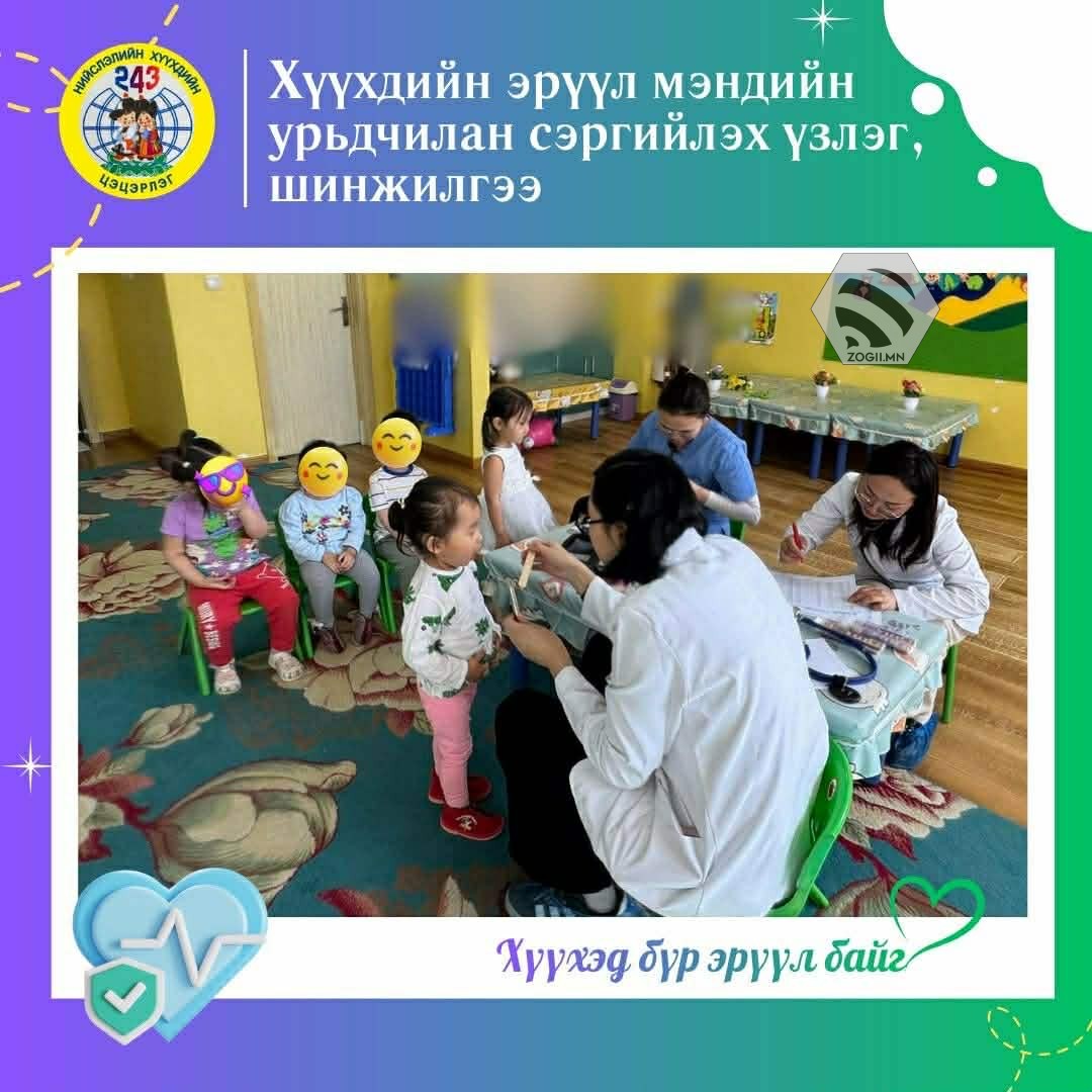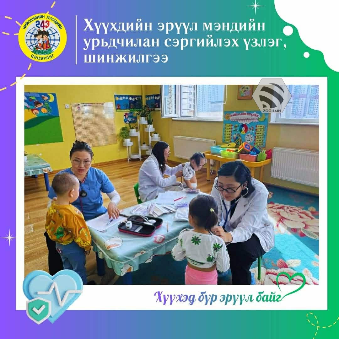 Нийслэлийн 243 дугаар цэцэрлэг байгуулагдсаны 10 жилийн ойг угтан "Алсын хараа-2050", "ЭРҮҮЛ ШҮД 2024-2027" арга хэмжээний хүрээнд Эх нярай, эмэгтэйчүүдийн үндэсний төв II-тэй хамтран "ХҮҮХДИЙН ЭРҮҮЛ МЭНДИЙН УРЬДЧИЛАН СЭРГИЙЛЭХ ҮЗЛЭГ, ШИНЖИЛГЭЭ"-г 2026 оны 04 сарын 01-02-ны өдрүүдэд амжилттай зохион байгууллаа.