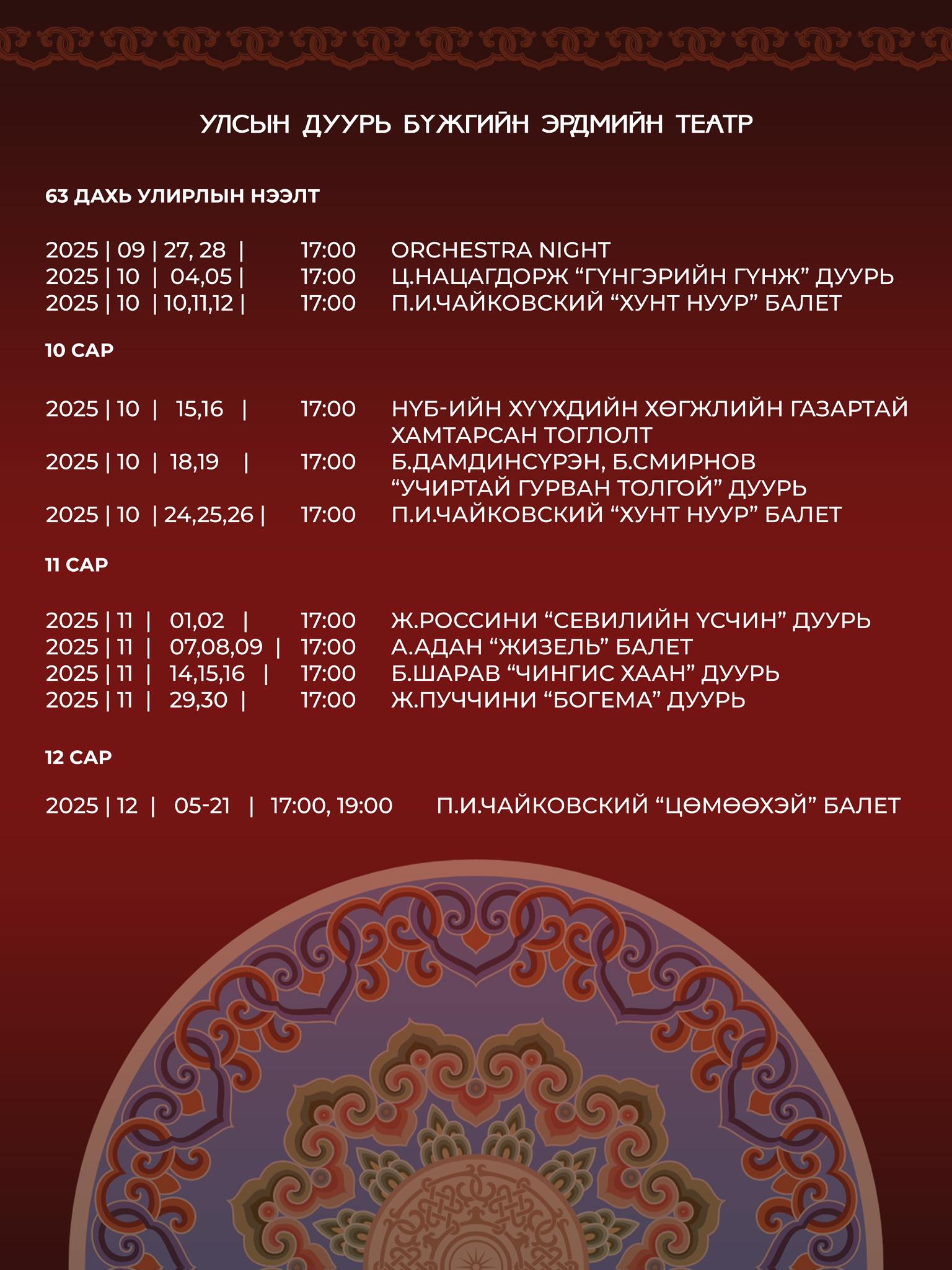 "Хунт нуур" балет 10 сарын 10-нд 19:00 цагт, 10 сарын 11, 12-нд 17:00 цагт тоглоно.