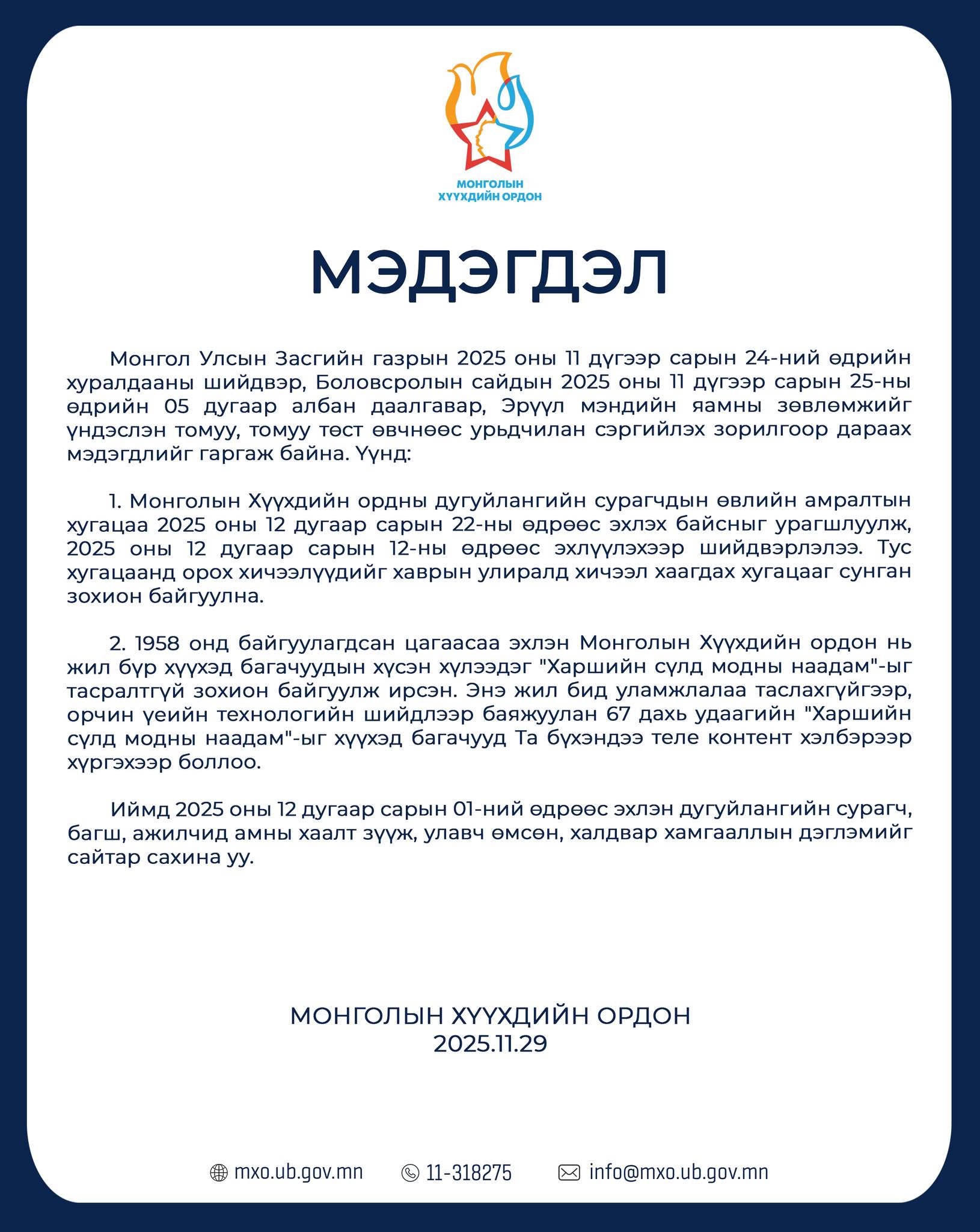 Хүүхдийн ордны дугуйлангуудын өвлийн амралт анх 2025 оны арванхоёрдугаар сарын 22-нд эхлэхээр төлөвлөгдсөн байсан ч нөхцөл байдалтай холбогдуулан 2025 оны арванхоёрдугаар сарын 12-ноос амралтад гаргахаар шийдвэрлэв. Амралтын хугацаанд орох байсан хичээлээс хоцрогдохгүй байх үүднээс хаврын улиралд хичээлийн үргэлжлэх хугацааг сунган нөхөж зохион байгуулахыг мэдэгдэлд дурджээ.