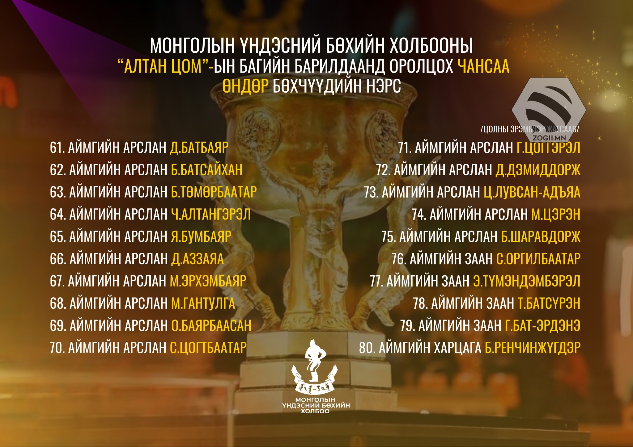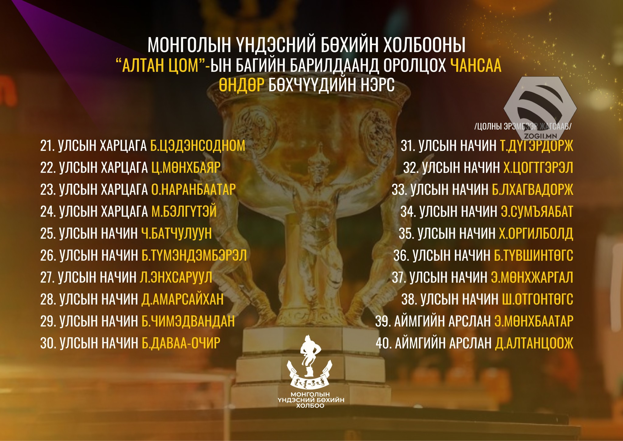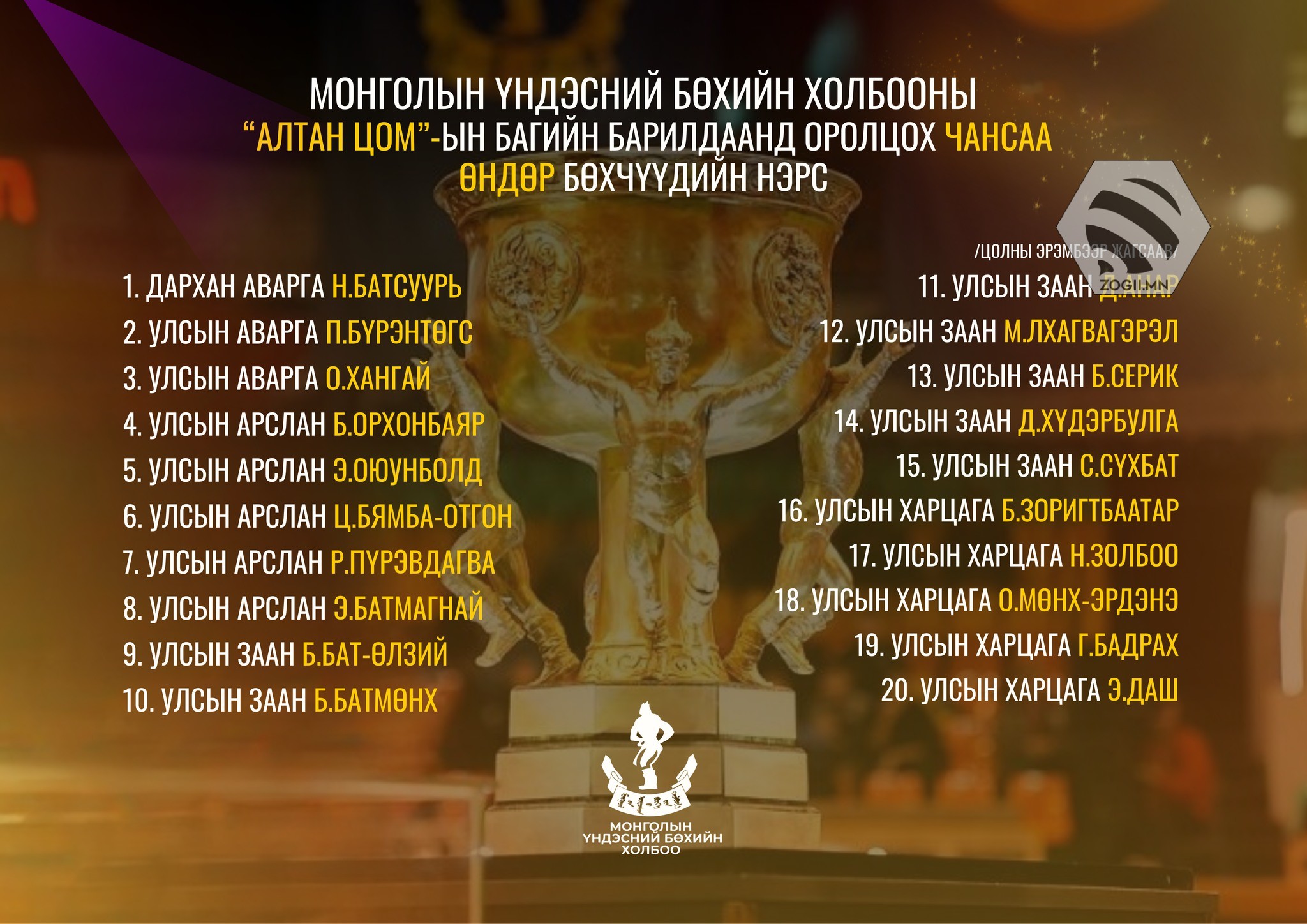 Монголын Үндэсний бөхийн холбооны "Алтан цом"-ын багийн барилдаанд оролцох боломжтой чансааны оноогоор тэргүүлсэн бөхчүүд.