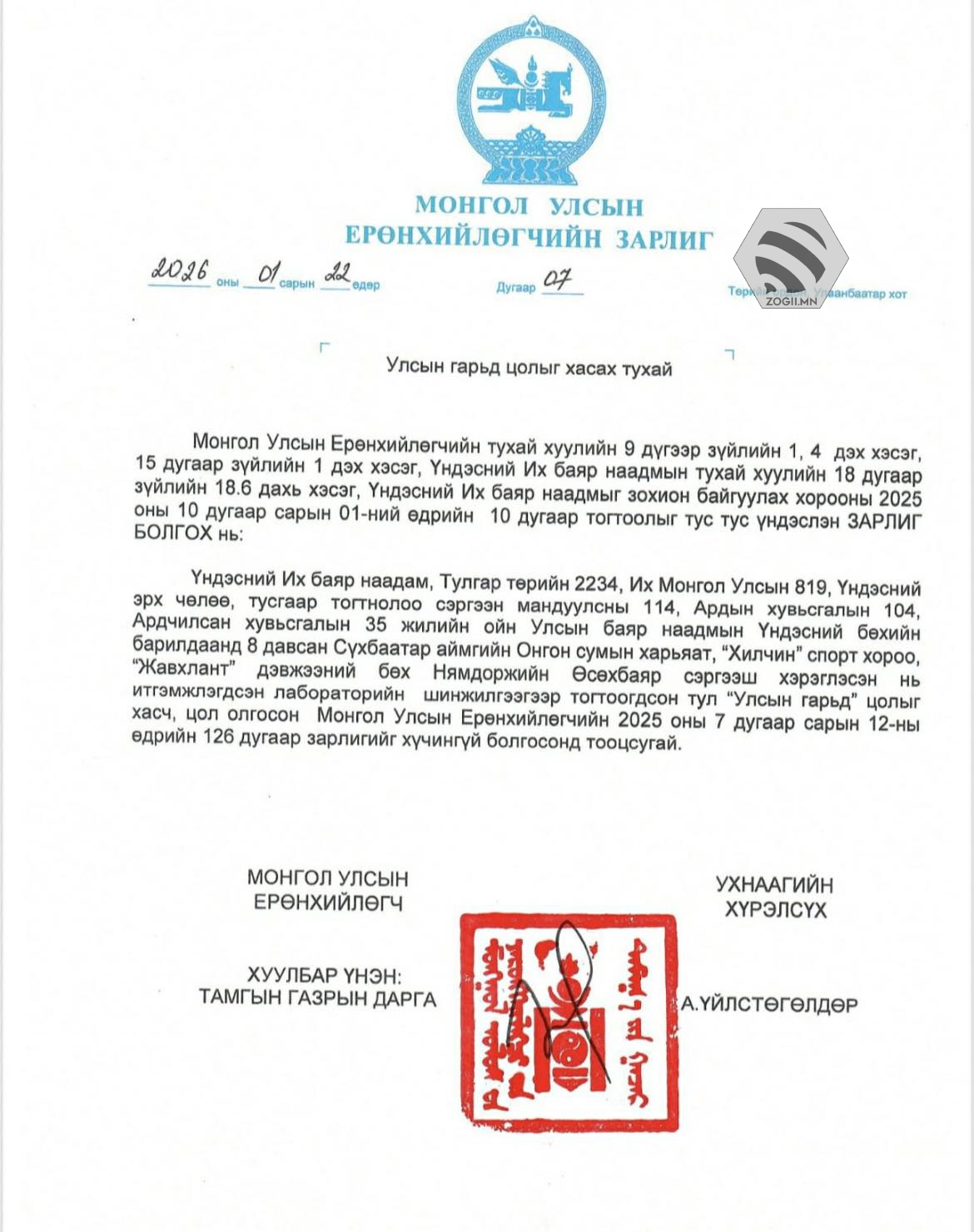 Тэгвэл Ерөнхийлөгч У.Хүрэлсүх энэ сарын 22-ны өдөр зарлиг гаргаж, Нямдоржийн Өсөхбаярын улсын гарди цолыг хураах шийдвэрийг баталгаажуулсан байна.