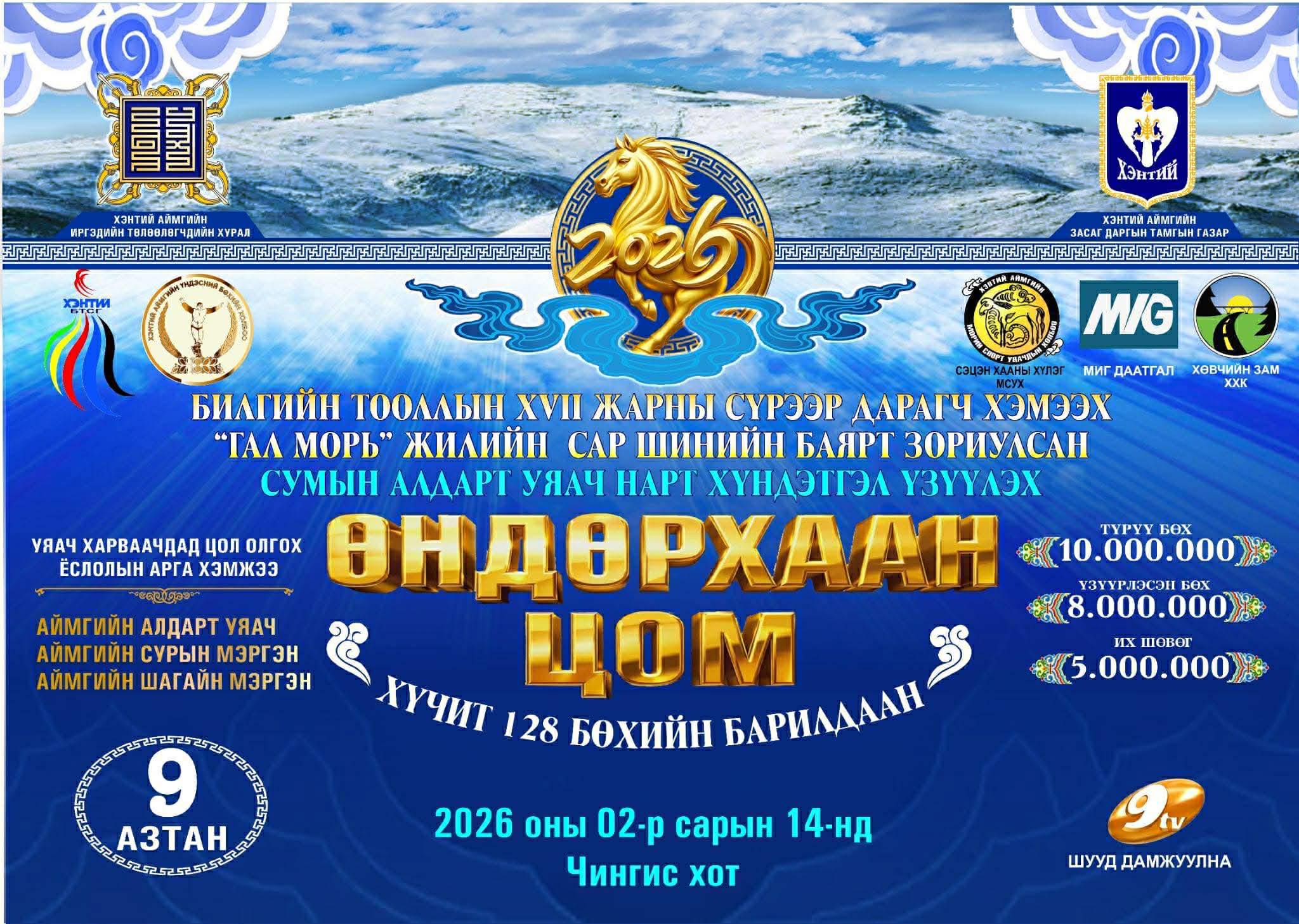Билгийн тооллын XVII жарны “СҮРЭЭР ДАРАГЧ” хэмээх гал морин жилийн Хэнтий аймгийн сар шинийн баярт зориулсан Хэнтий аймгаас төрөн гарсан “АЙМГИЙН АРСЛАН” цолтой бөхчүүд, ахмад “СУМЫН АЛДАРТ УЯАЧ" нарт хүндэтгэл үзүүлэх "ӨНДӨРХААНЫ ЦОМ” үндэсний бөхийн барилдаан 2026 оны 02 дугаар сарын 14-ний бямба гарагийн 10:30 цагт Хэнтий аймгийн Биеийн тамир, спортын газрын "Спортын ордон"-д болно.
