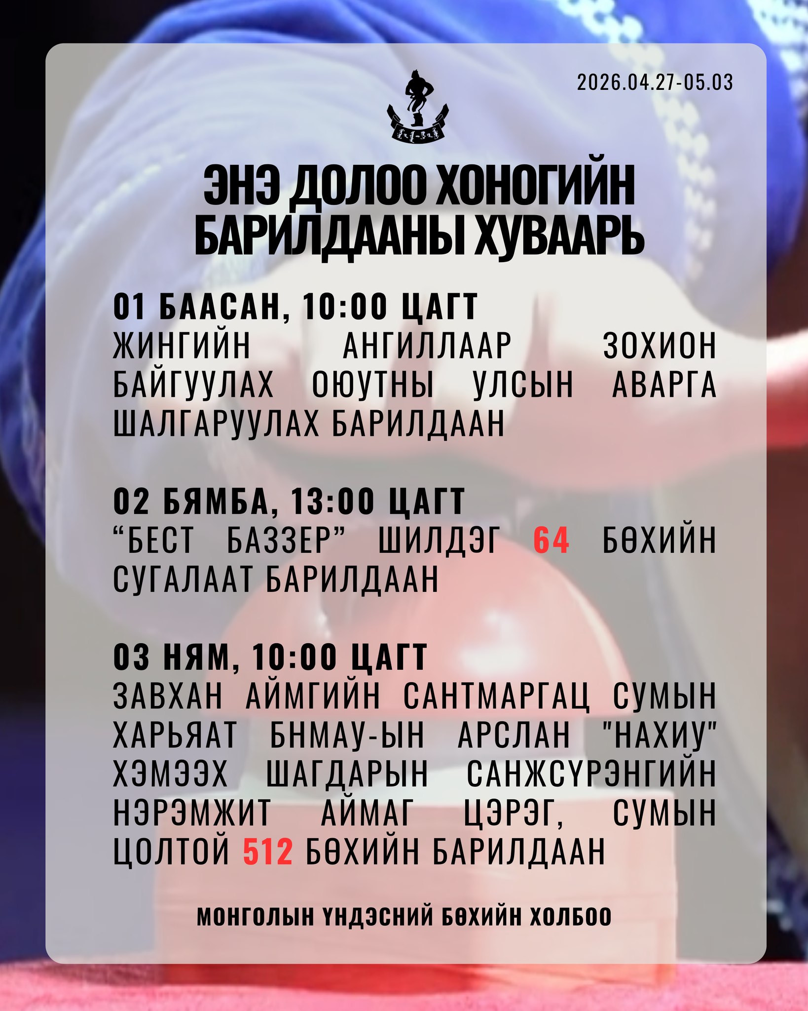 Монголын үндэсний бөхийн холбооноос энэ 7 хоногт зохион байгуулах албан ёсны барилдааны хуваарийг танилцуулж байна.