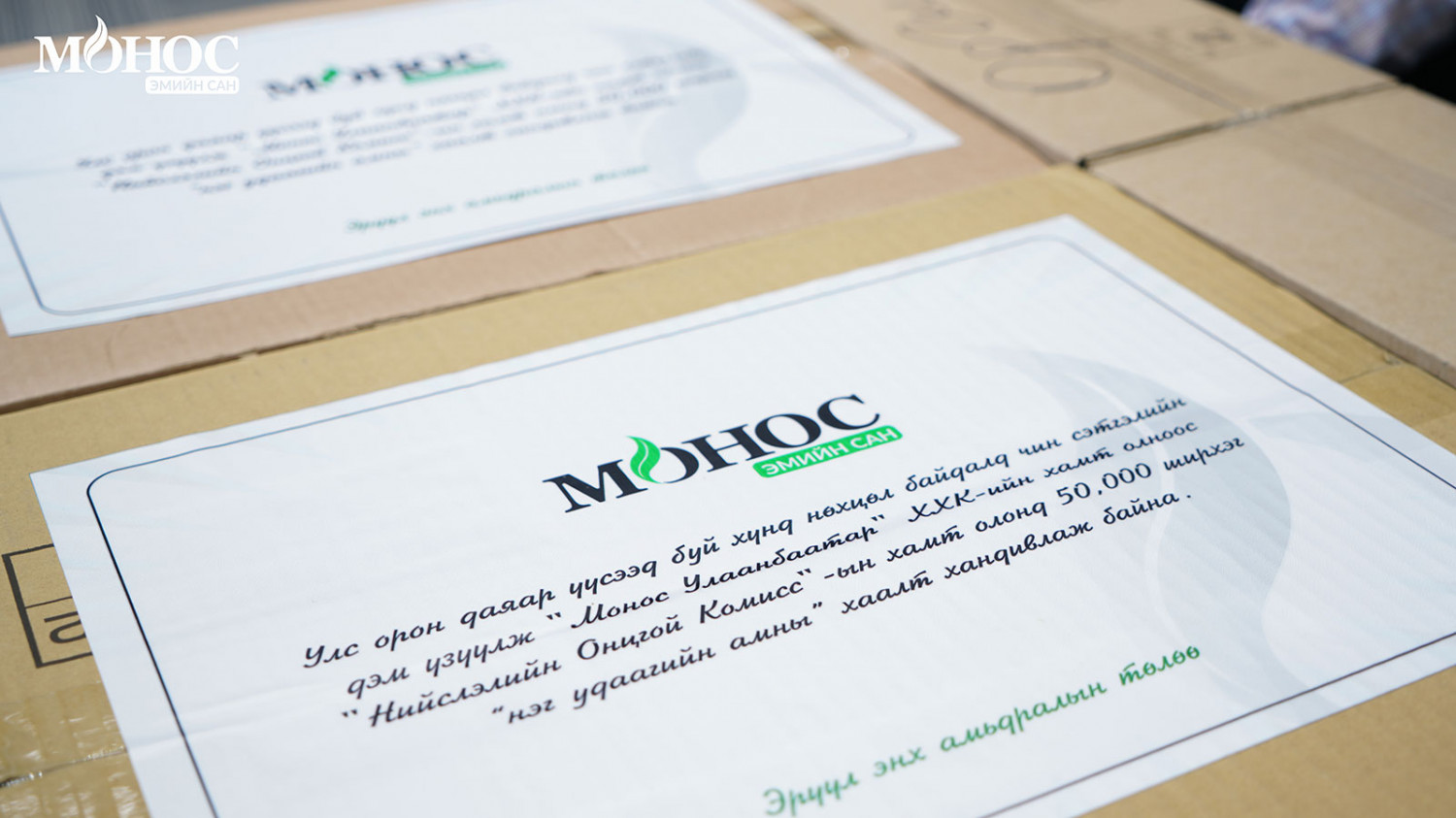 Монос эмийн сан Нийгмийн хариуцлагын хүрээнд Монгол улс орон даяар үүсээд буй хүнд нөхцөл байдалд чин сэтгэлийн дэм үзүүлж "Нийслэлийн Онцгой Комисс"-ын хамт олонд 50,000 ширхэг нэг удаагийн амны хаалт хандивлаж байна. Мөн хүнд хэцүү цаг байдалд хамтдаа сэргийлж хамтдаа давъя уриалга дор Монос эмийн сангаас 30,000₮ дээш худалдан авалт хийсэн хүн бүрт 12-р сарыг дуустал 10 ширхэг нэг удаагийн амны хаалт бэлэглэж байна.
