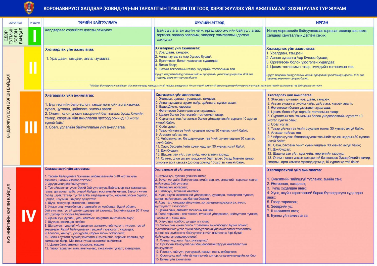 Коронавирусний халдварын нөхцөл байдалтай холбоотойгоор дөрөвдүгээр сарын 10-наас 25-ныг хүртэл хугацаанд бүх нийтийн бэлэн байдлын зэрэгт буюу улаан түвшинд шилжихээр боллоо. Энэ хугацаанд дараах үйл ажиллагааг хязгаарлахгүй.
