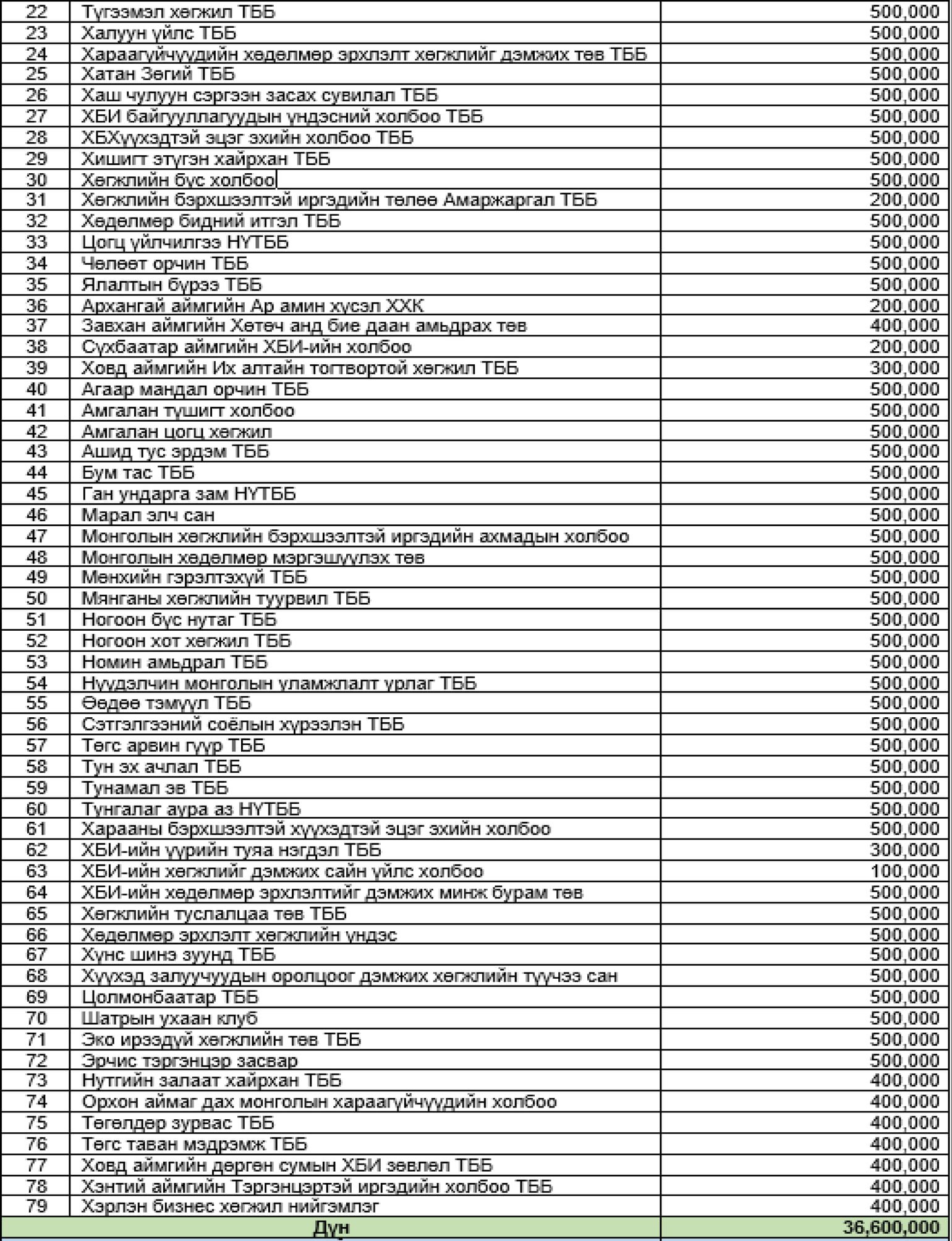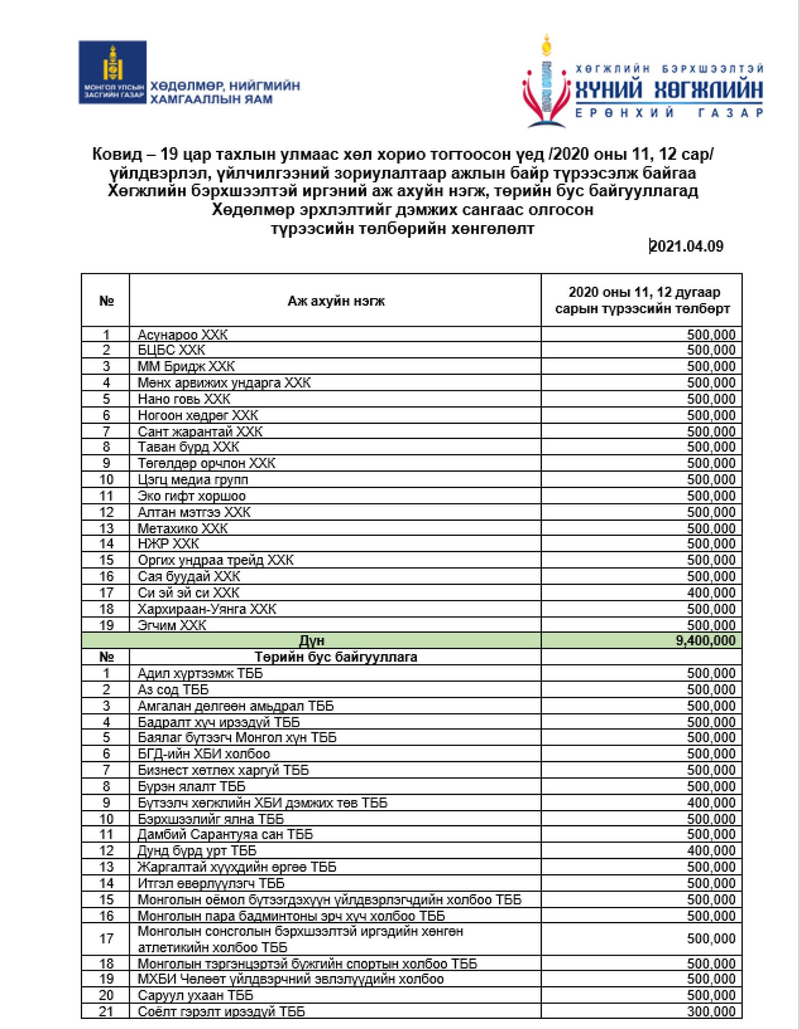 Дээрх хугацаанд Хөдөлмөр эрхлэлтийг дэмжих сангаас нийт 19 ААН-д 9 сая 400 мянга, 79 төрийн бус байгууллагад 36 сая 300 мянган төгрөгийн түрээсийн төлбөрийн хөнгөлөлт олгожээ.