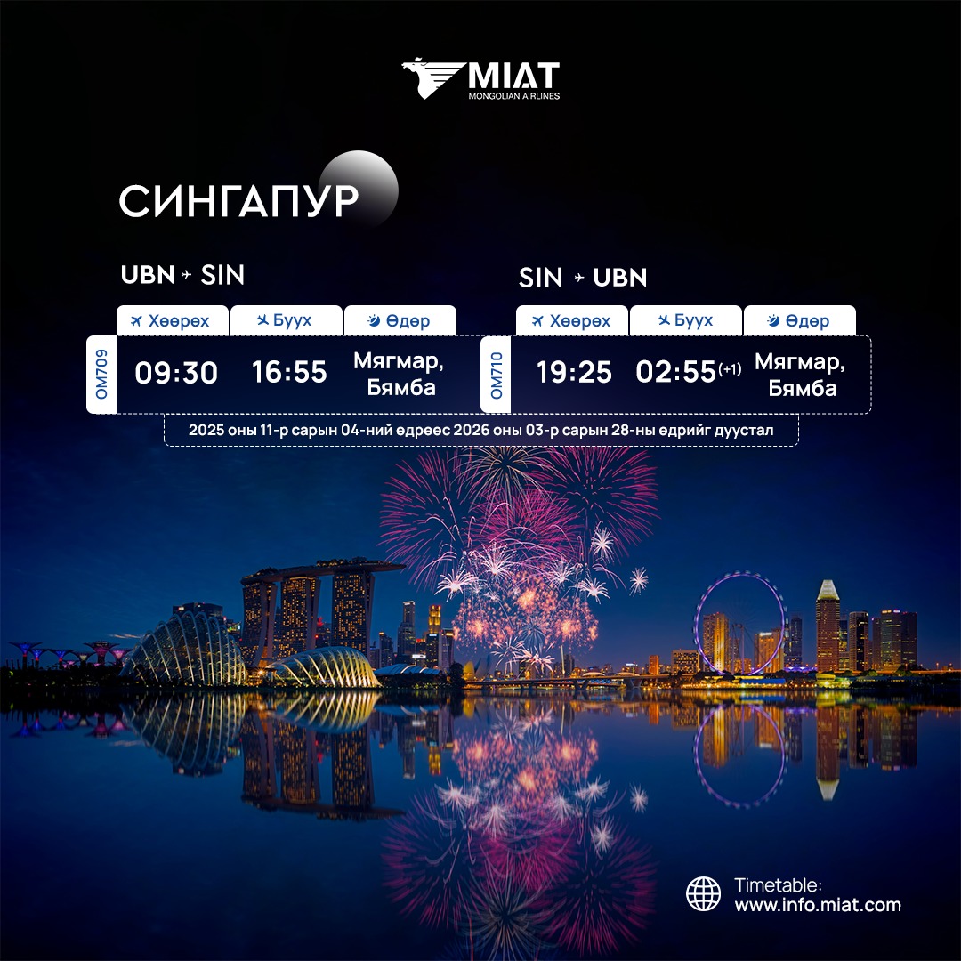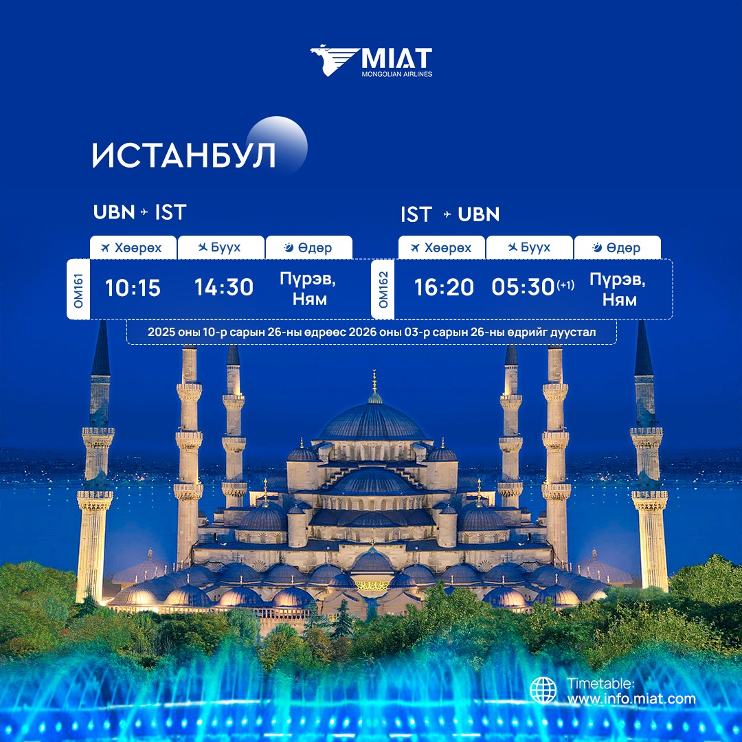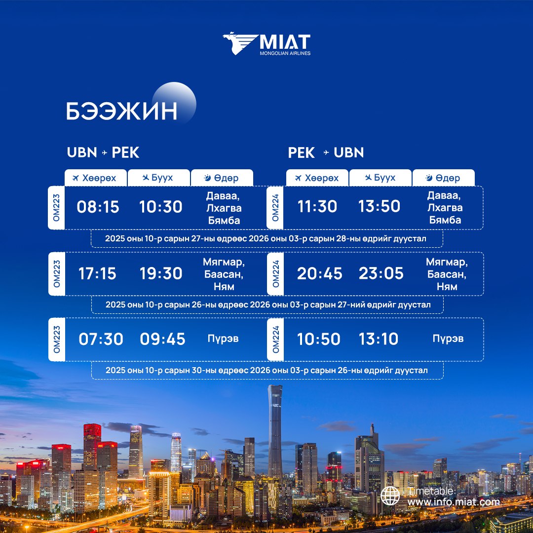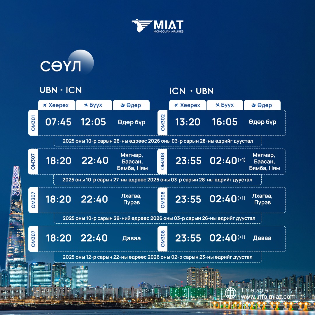 2025 оны 10-р сарын 22-ны өдрөөс 2026 оны 03-р сарын 28-ны өдрийг дуустал хугацаанд мөрдөх олон улсын нислэгийн өвлийн цагийн хуваарийг танилцуулж байна.