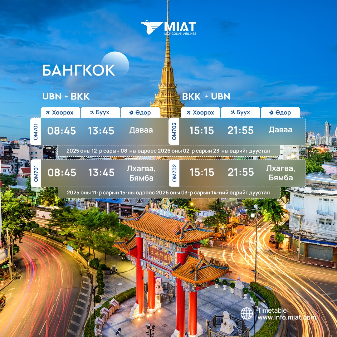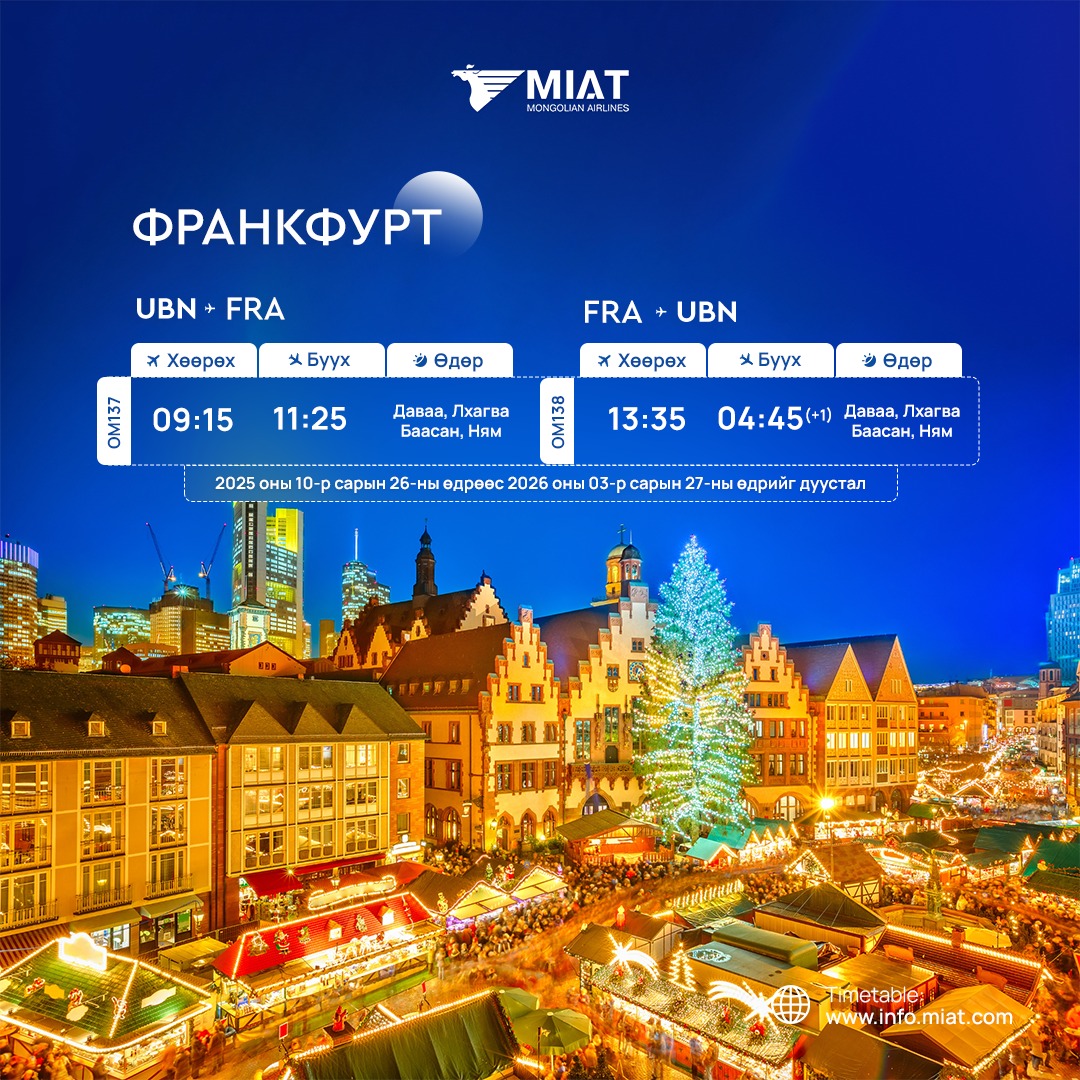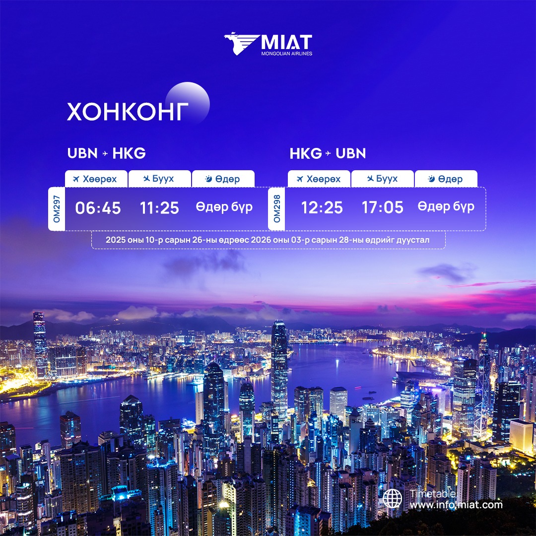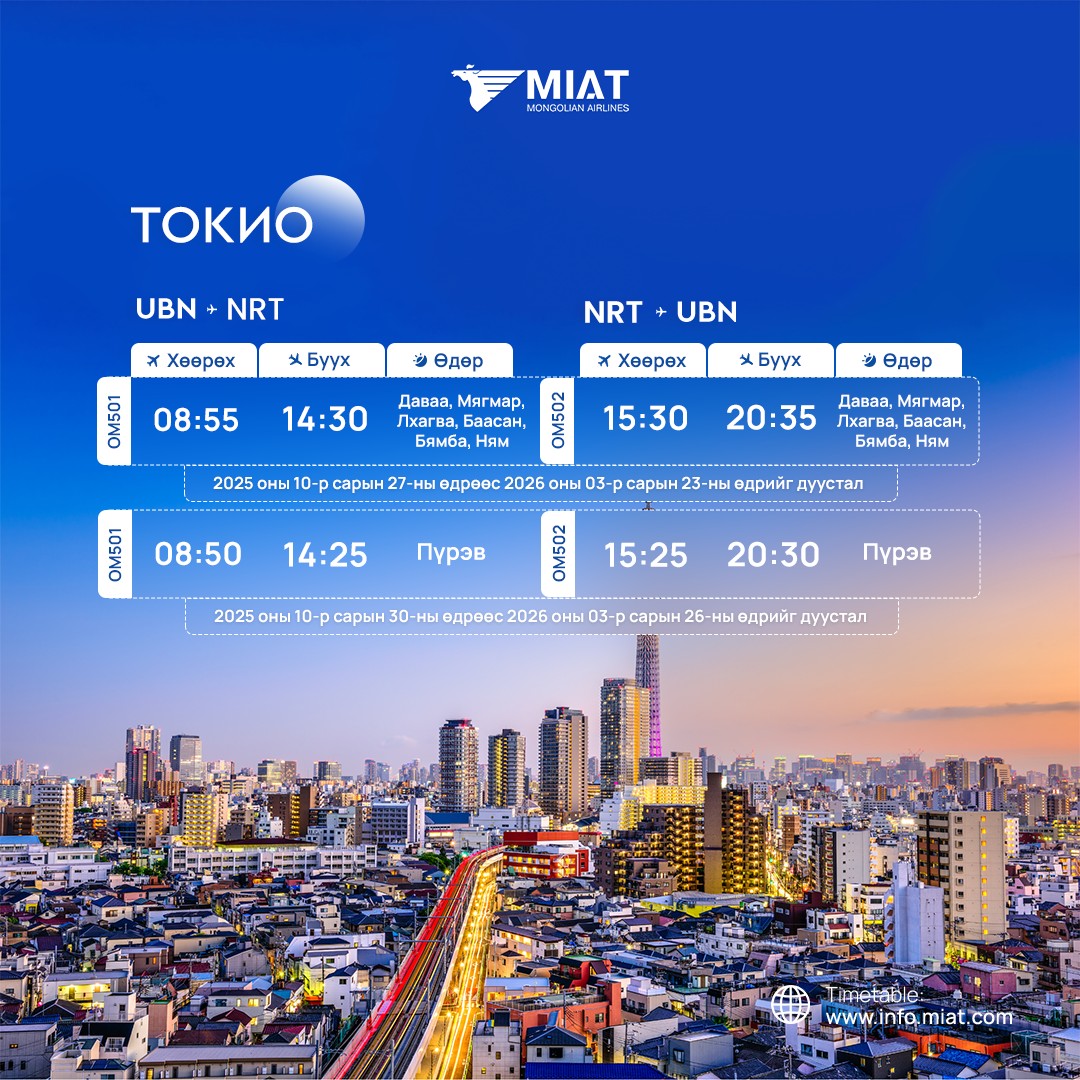 2025 оны 10-р сарын 22-ны өдрөөс 2026 оны 03-р сарын 28-ны өдрийг дуустал хугацаанд мөрдөх олон улсын нислэгийн өвлийн цагийн хуваарийг танилцуулж байна.