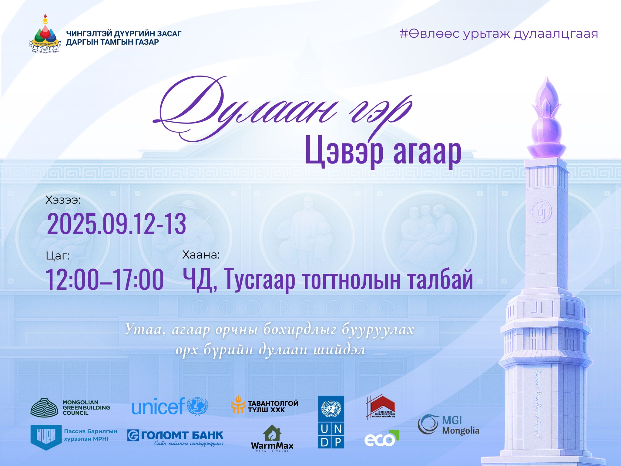 Гэр хорооллын айл өрхөд зориулсан дулаалгын шийдлийг танилцуулах "Дулаан гэр-Цэвэр агаар 2025" арга хэмжээ 2025 оны 09 дүгээр сарын 12,13-ны өдрүүдийн 12:00-17:00 цагт Тусгаар тогтнолын талбайд болно.