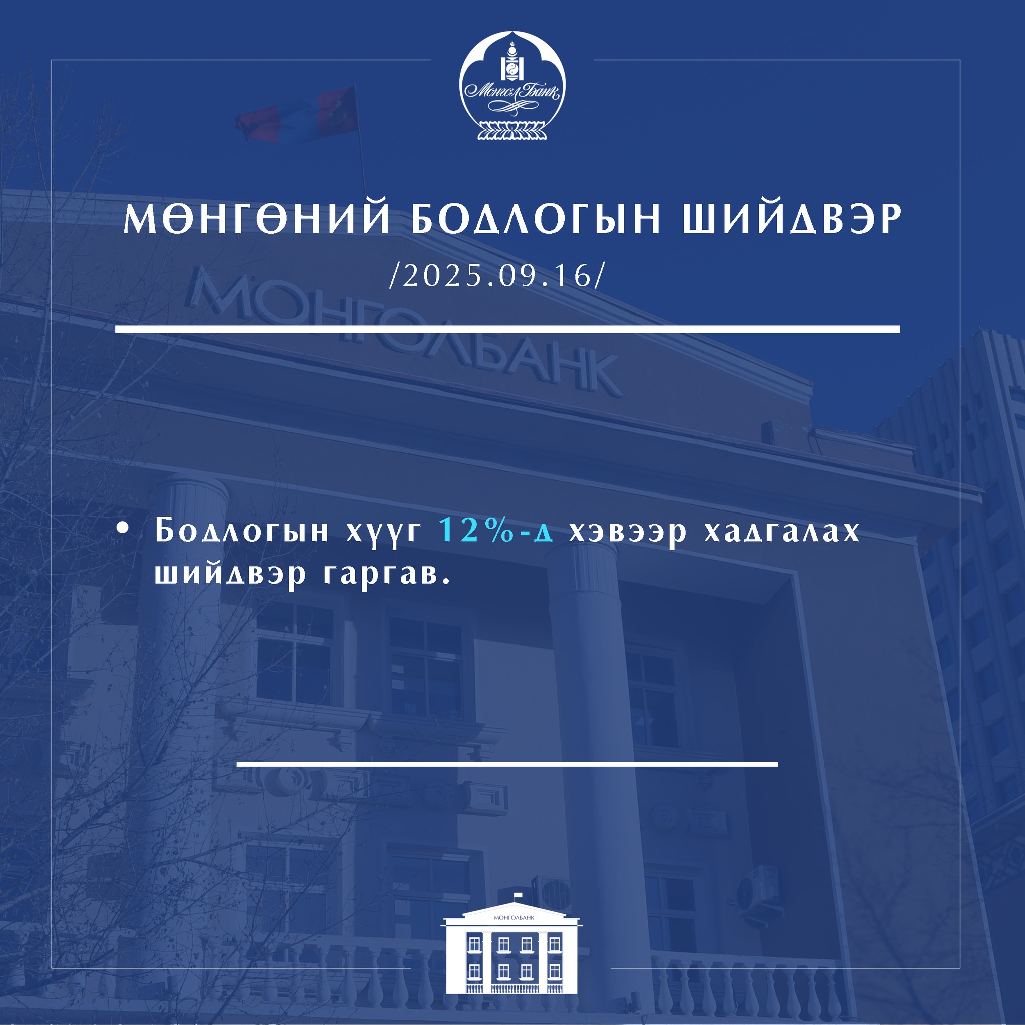 Монголбанкны Мөнгөний бодлогын хорооны 2025 оны 9 дүгээр сарын 15, 16-ны өдрийн ээлжит хурлаар эдийн засаг, банк, санхүүгийн зах зээлийн өнөөгийн байдал, дотоод, гадаад орчны төлөв, эрсдэлийг харгалзан үзээд бодлогын хүүг 12 хувьд хэвээр хадгалах шийдвэр гаргалаа.