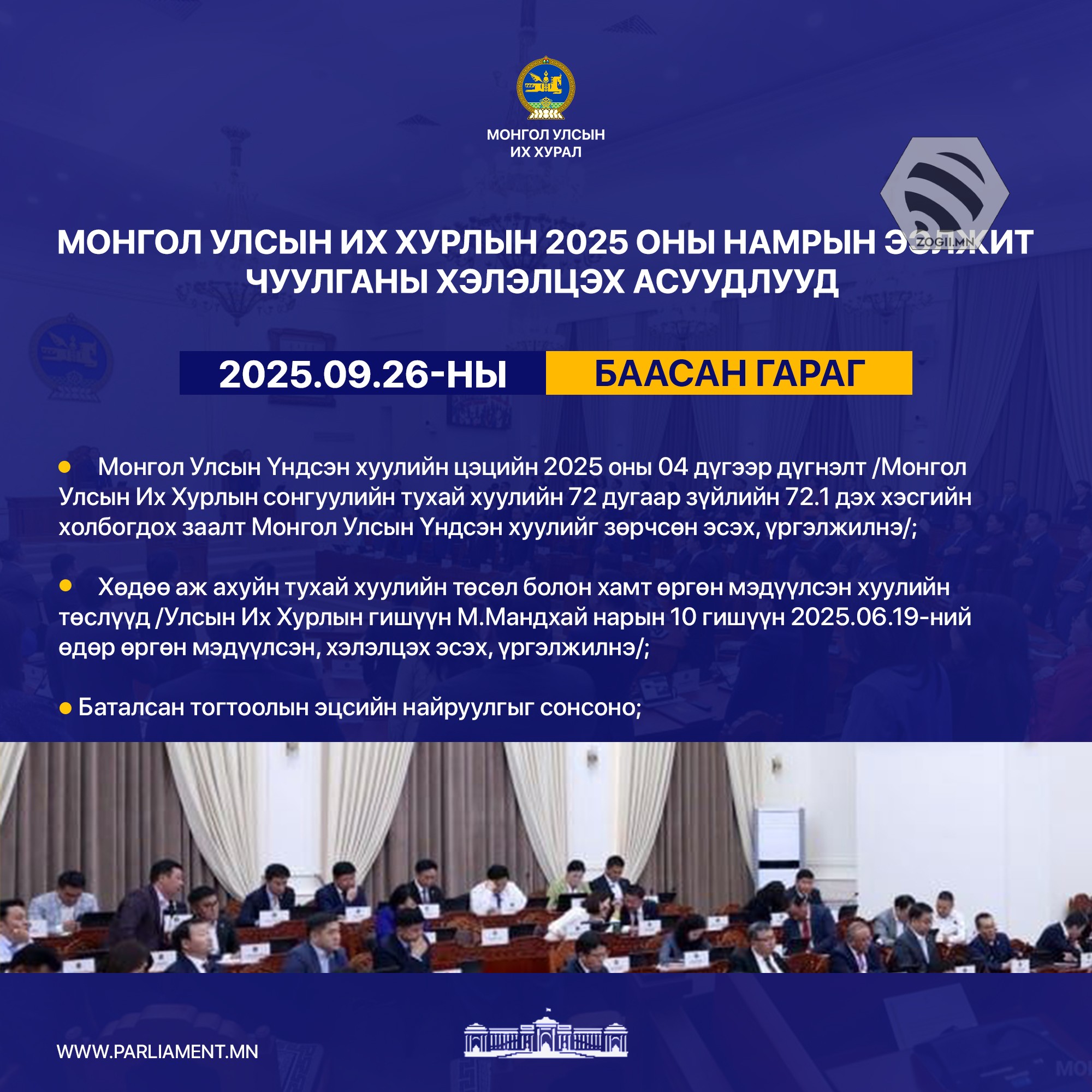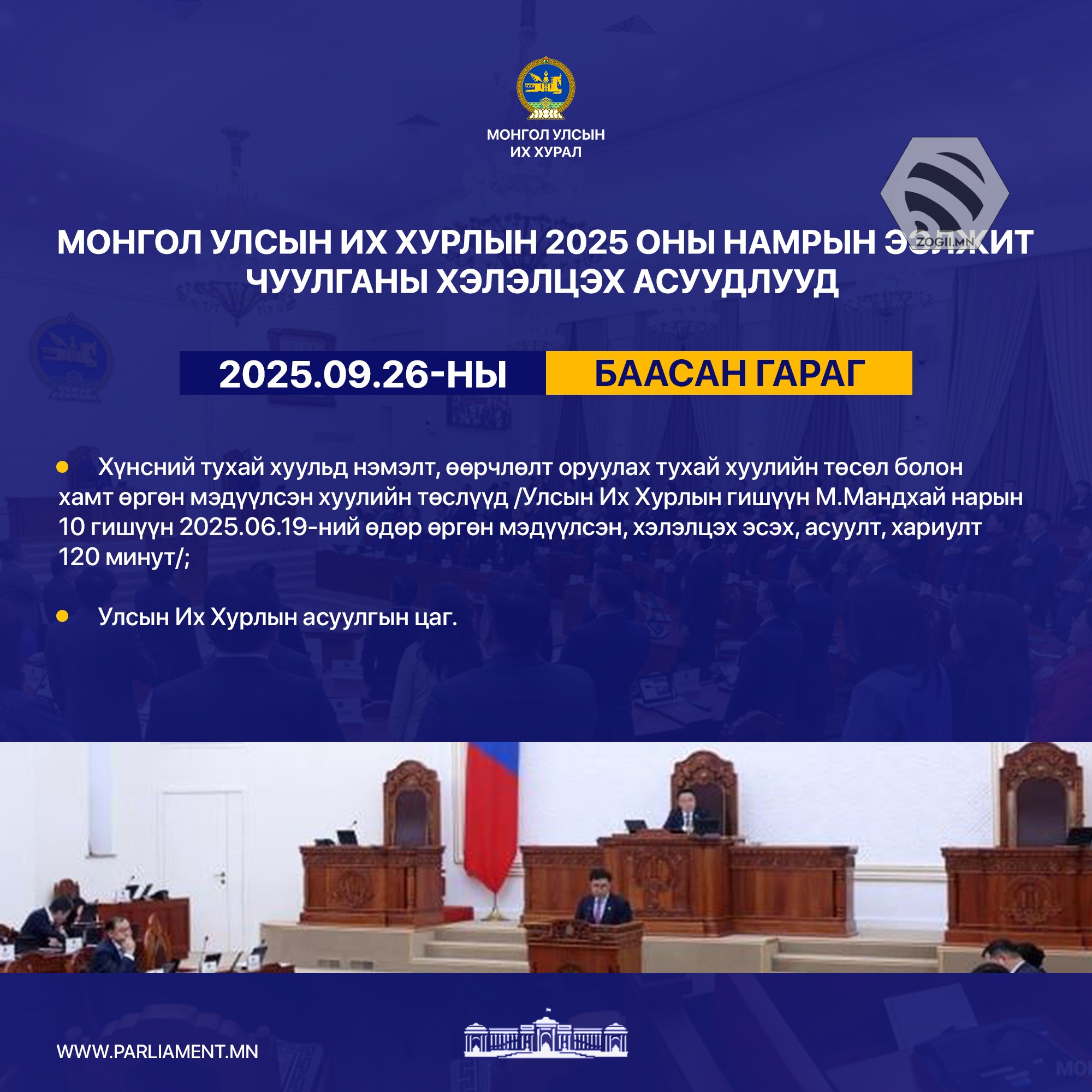 Монгол Улсын Их Хурлын 2025 оны намрын ээлжит чуулганы өнөөдрийн /2025.09.26/ хуралдаанаар хэлэлцэх асуудлуудыг танилцуулж байна.