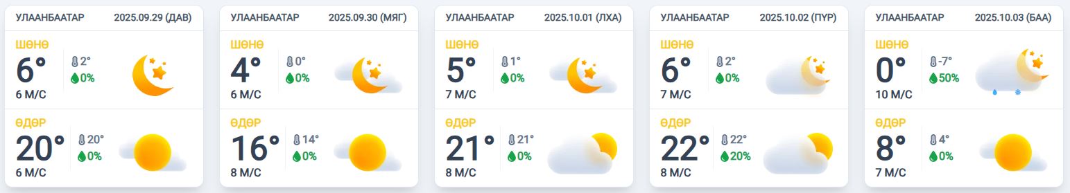 2025 оны 09-р сарын 30-наас 10-р сарын 04-нийг хүртэлх цаг агаарын урьдчилсан төлөв: