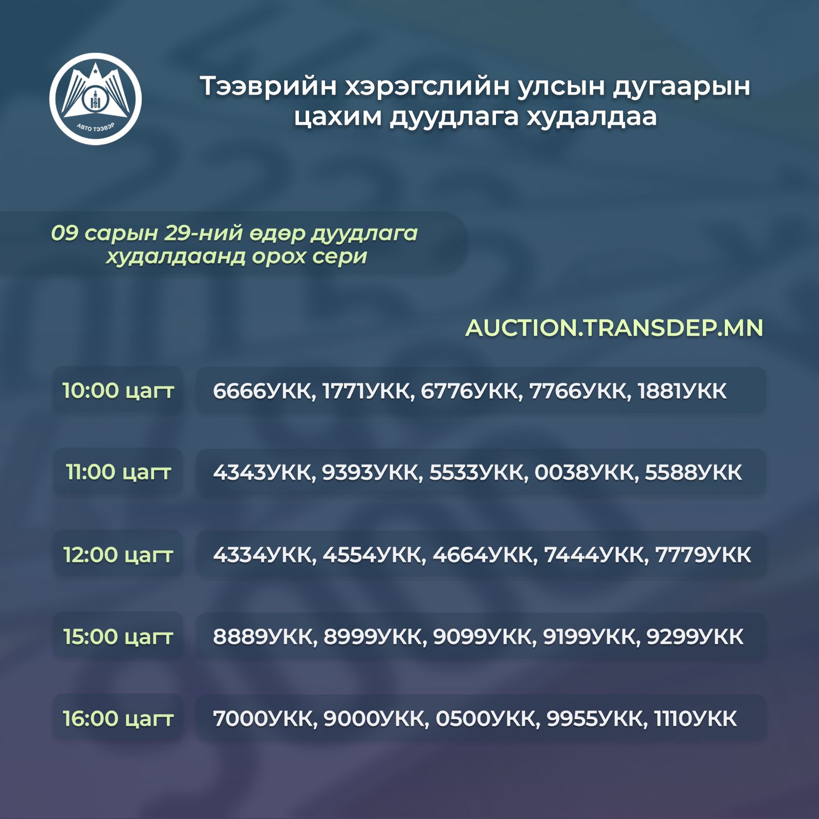 Автомашины азын дугаарын дуудлага худалдаа өнөөдөр буюу есдүгээр сарын 29-ний өдөр 10:00, 11:00, 12:00, 15:00, 16:00 цагуудад зохион байгуулагдана.