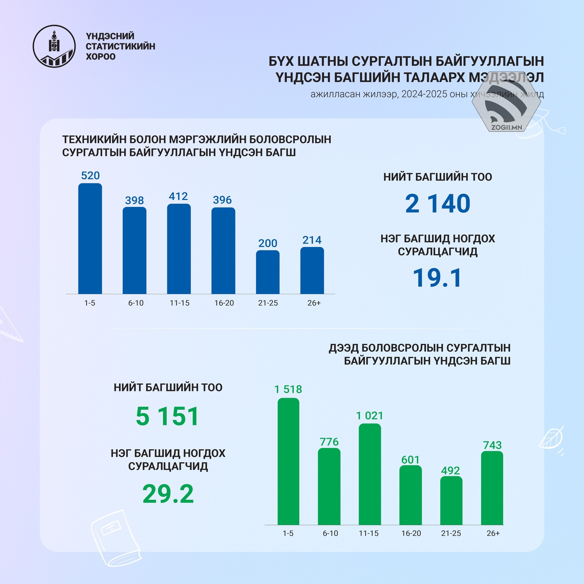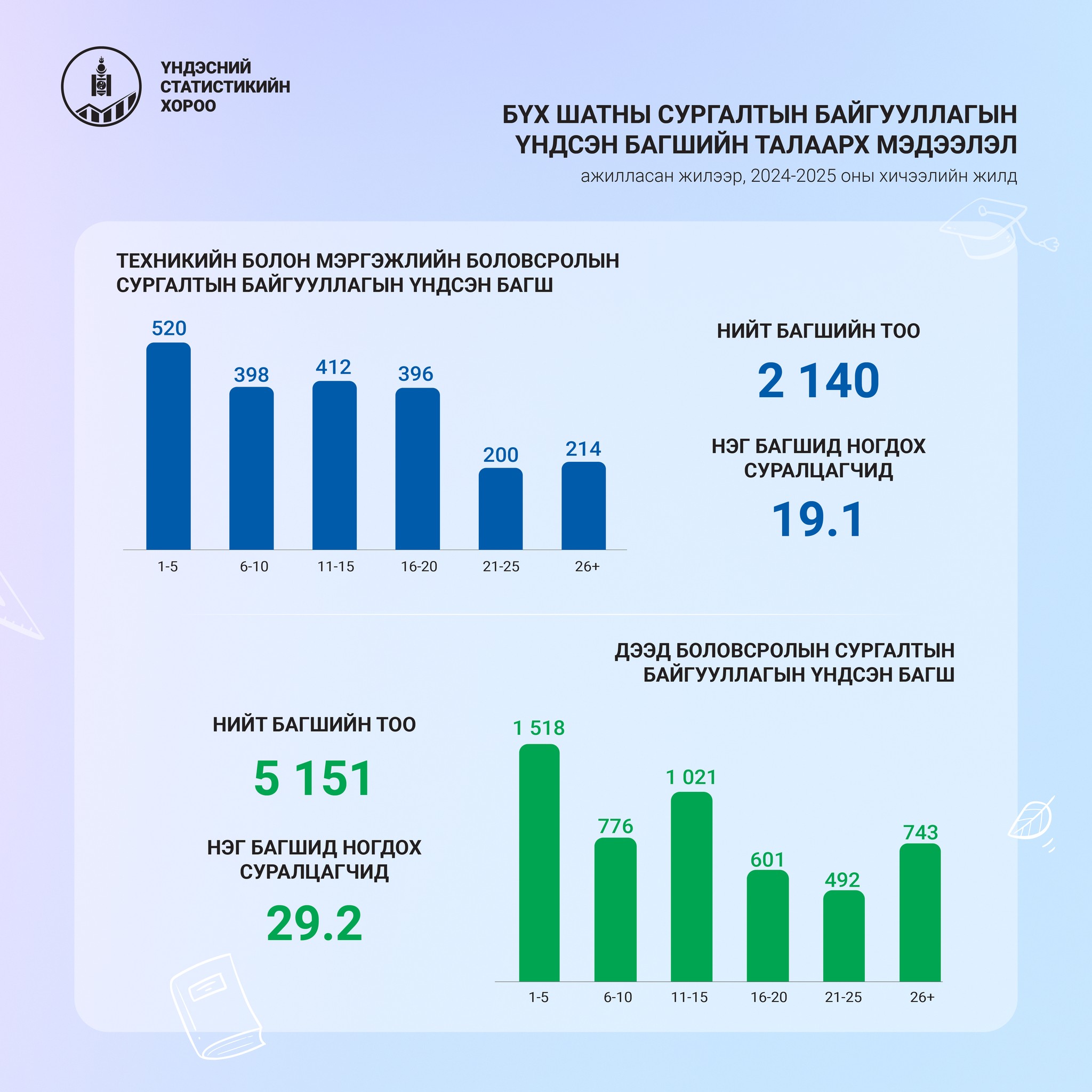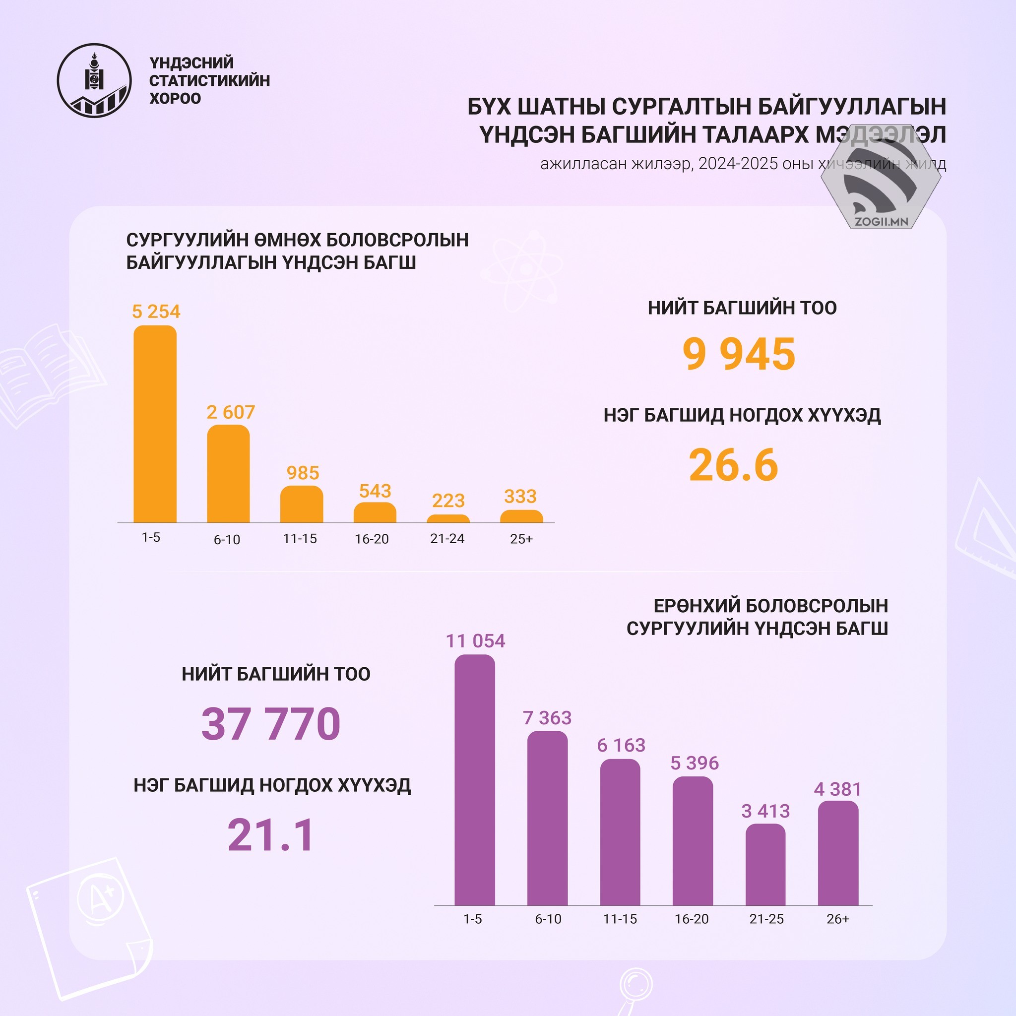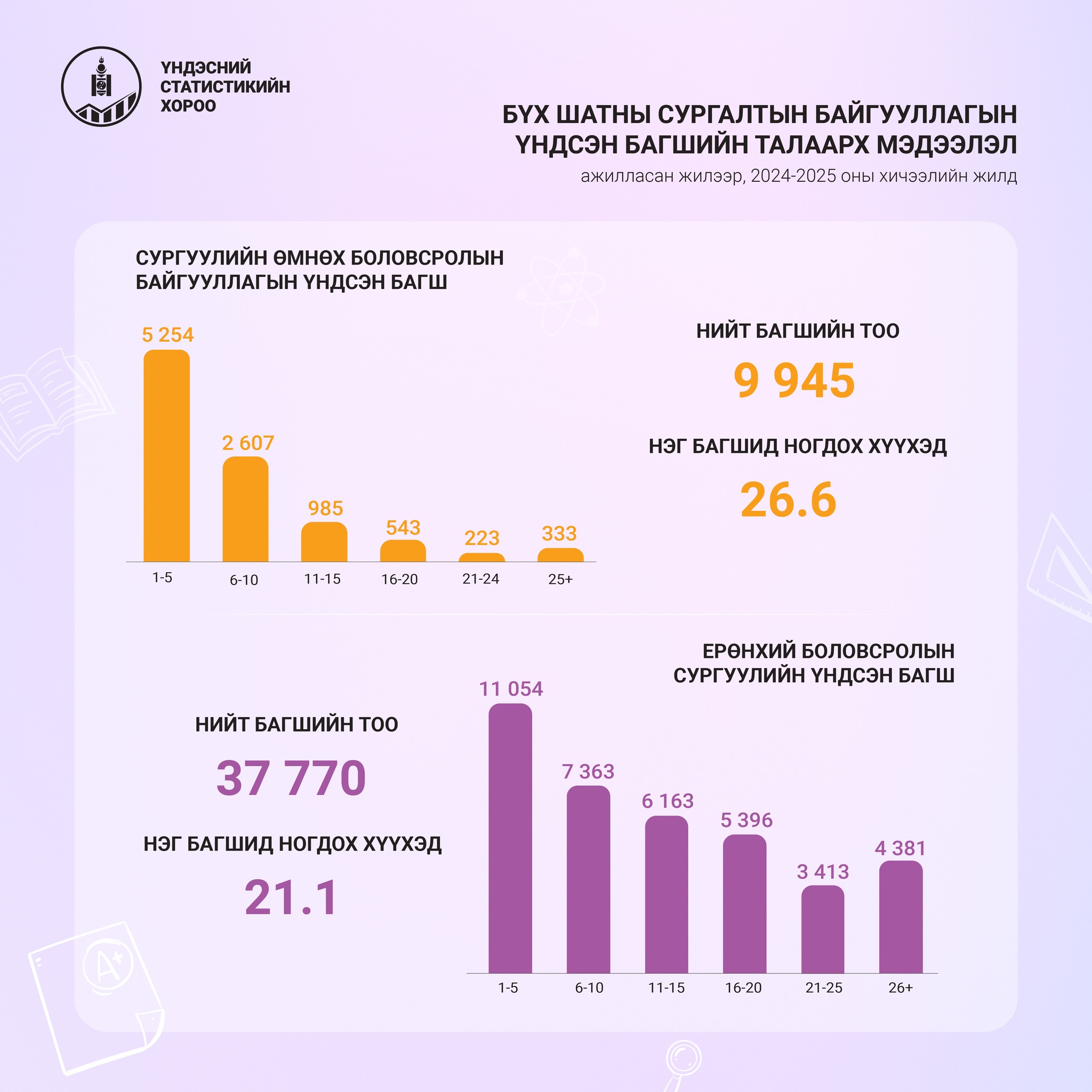 Боловсролын яамны мэдээллээр 2024-2025 оны хичээлийн жилд бүх шатны боловсролын байгууллагад 55.0 мянган үндсэн багш ажиллаж байна. Сургуулийн өмнөх боловсролын байгууллагын нэг багшид дунджаар 27 хүүхэд ногдож байгаа бол ерөнхий боловсролын сургуулийн нэг багшид 21 хүүхэд ногдож байна. ЮНЕСКО-оос 1994 онд жил бүрийн аравдугаар сарын 5-ны өдрийг “Дэлхийн багш нарын өдөр” болгон тэмдэглэж эхэлсэн түүхтэй.