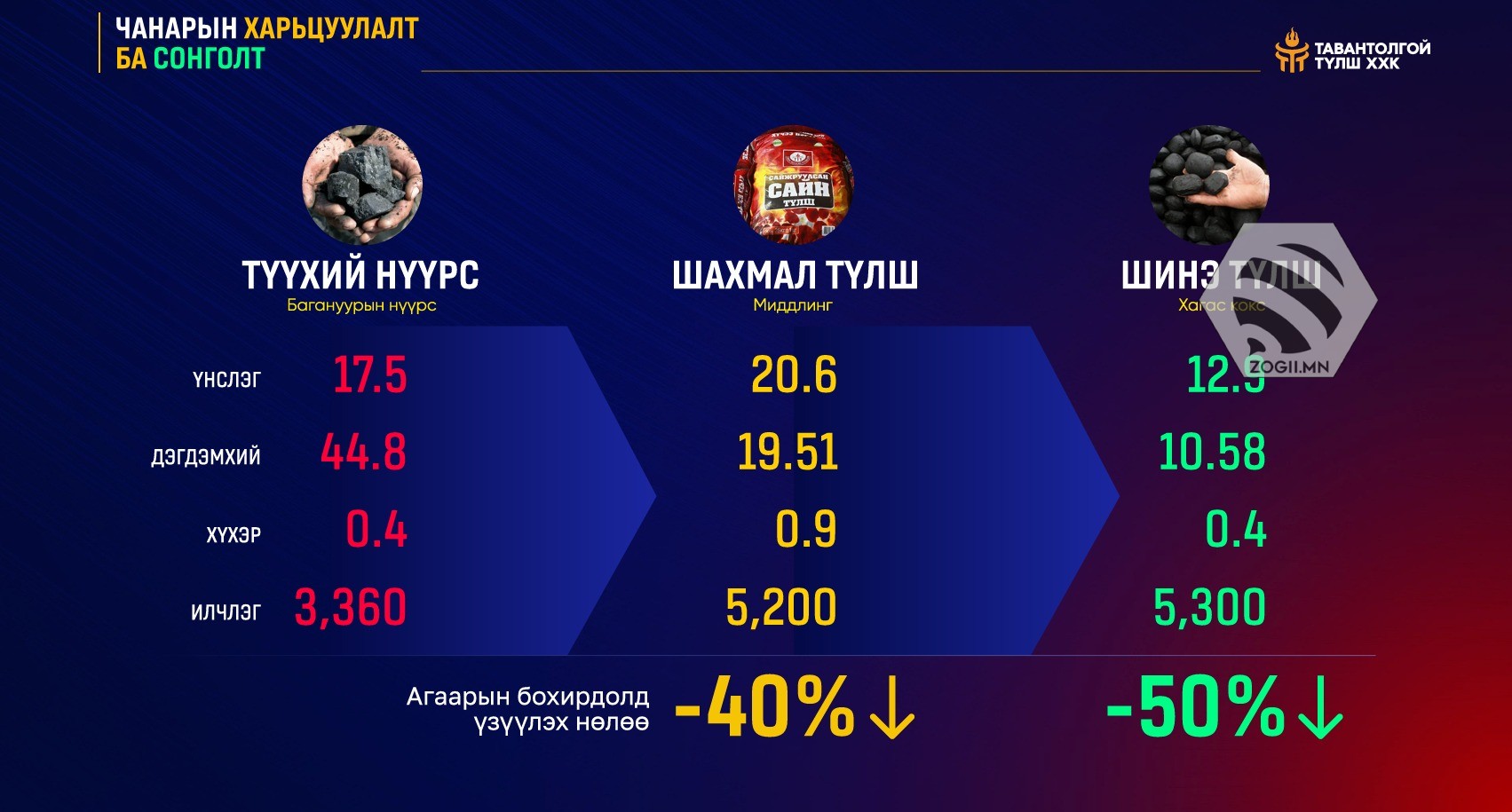2025-2026 оны халаалтын улиралд нийслэлчүүдийн хэрэглээнд нэвтрүүлж буй хагас коксон түлшний 1 тонныг 200 000 төгрөг, 1 шуудайг 5000 төгрөгөөр худалдан борлуулахаар шийдвэрлэв. Мөн аж ахуйн нэгжүүдэд нийлүүлэх угаан баяжуулсан эрчим хүчний нүүрс (мидлинг)-ний нэг тонн тутмын үнийг 250 000 төгрөгөөр тогтоолоо.