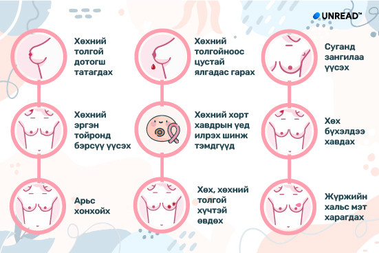 Эмэгтэйчүүдийн хөхтэй холбоотой түгээмэл тохиолддог өвчнүүдийг дурдвал: