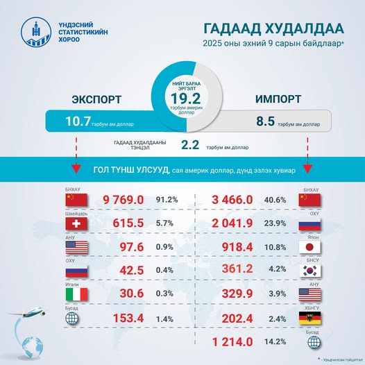 Монгол Улс 2025 оны эхний 9 сард нийт 160 улстай худалдаа хийж, гадаад худалдааны нийт бараа эргэлт 19.2 тэрбум ам.доллар болсон байна. Үүнээс экспорт 10.7 тэрбум ам.доллар, импорт 8.5 тэрбум ам.доллар болж, тэнцэл 2.2 тэрбум ам.долларын ашигтай гарчээ.