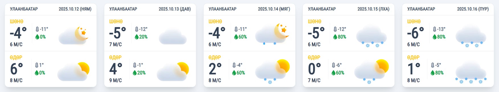 2025 оны 10-р сарын 13-наас 10-р сарын 17-ныг хүртэлх цаг агаарын урьдчилсан төлөв: