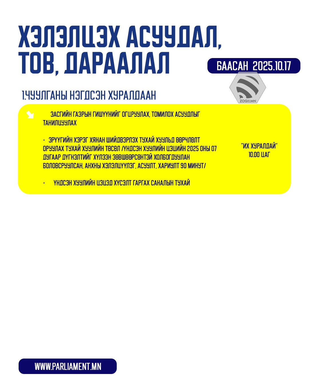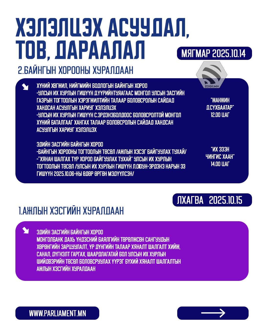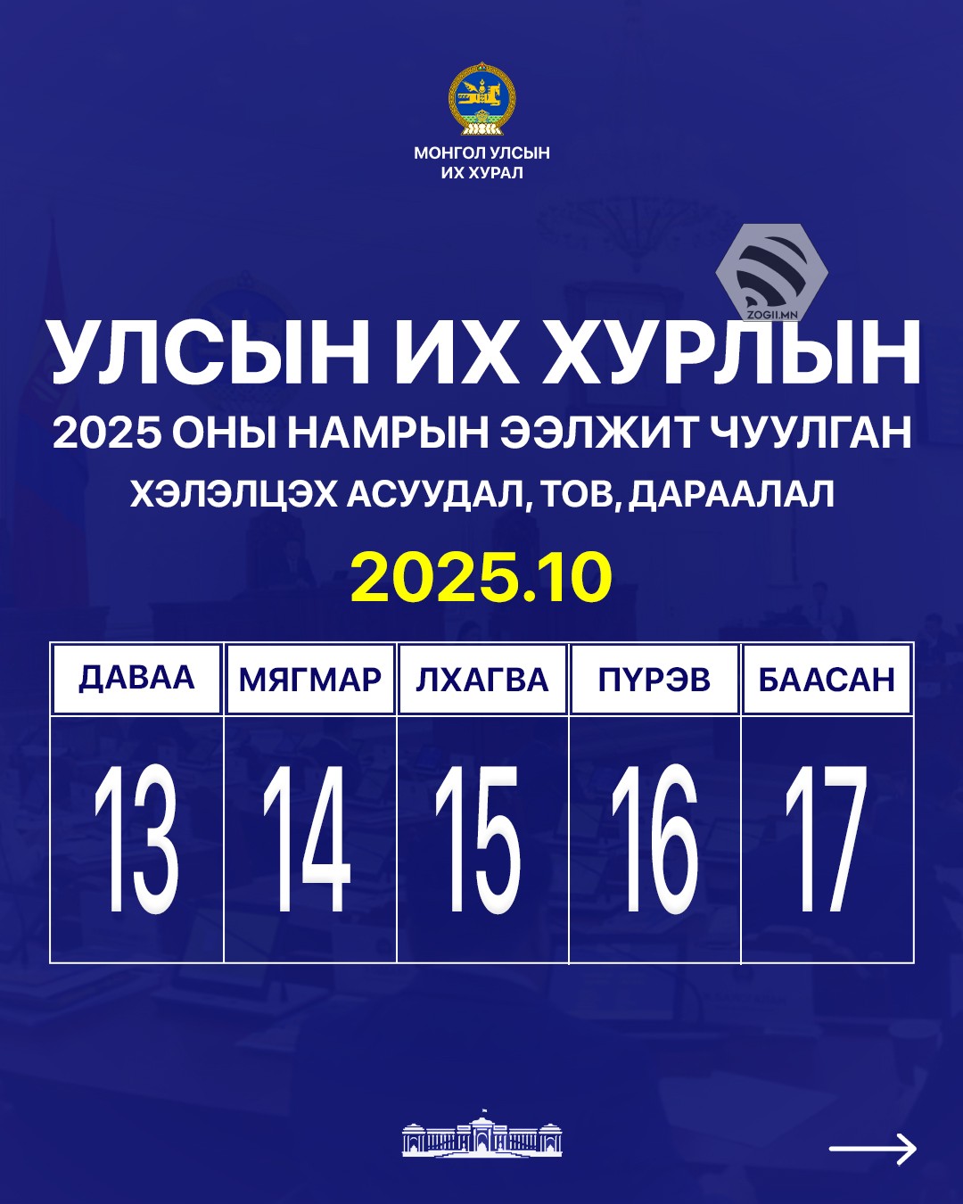 Улсын их хурлын 2025 оны намрын ээлжит чуулганы 2025 оны 10 дугаар сарын 13-наас 17-ны өдрийн хуралдаанаар хэлэлцэх асуудлын тов, дарааллыг танилцуулж байна.