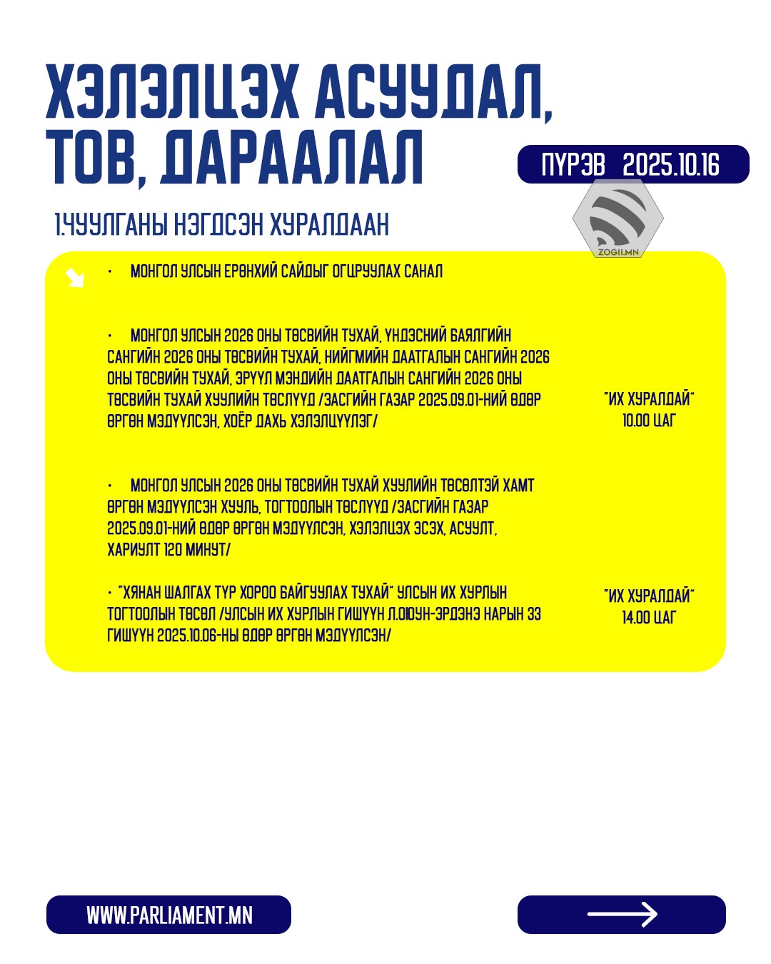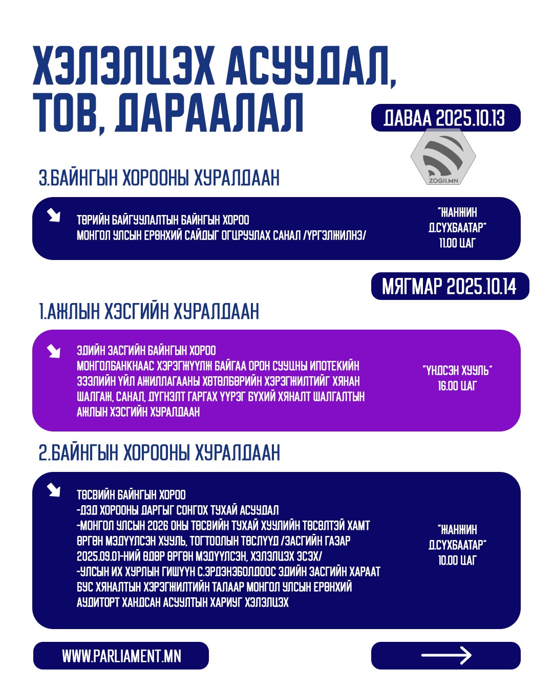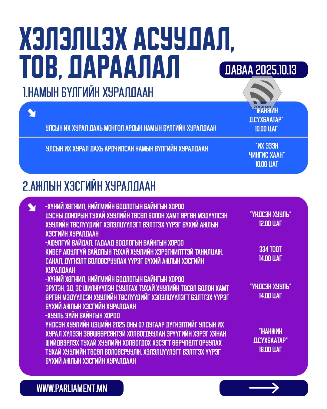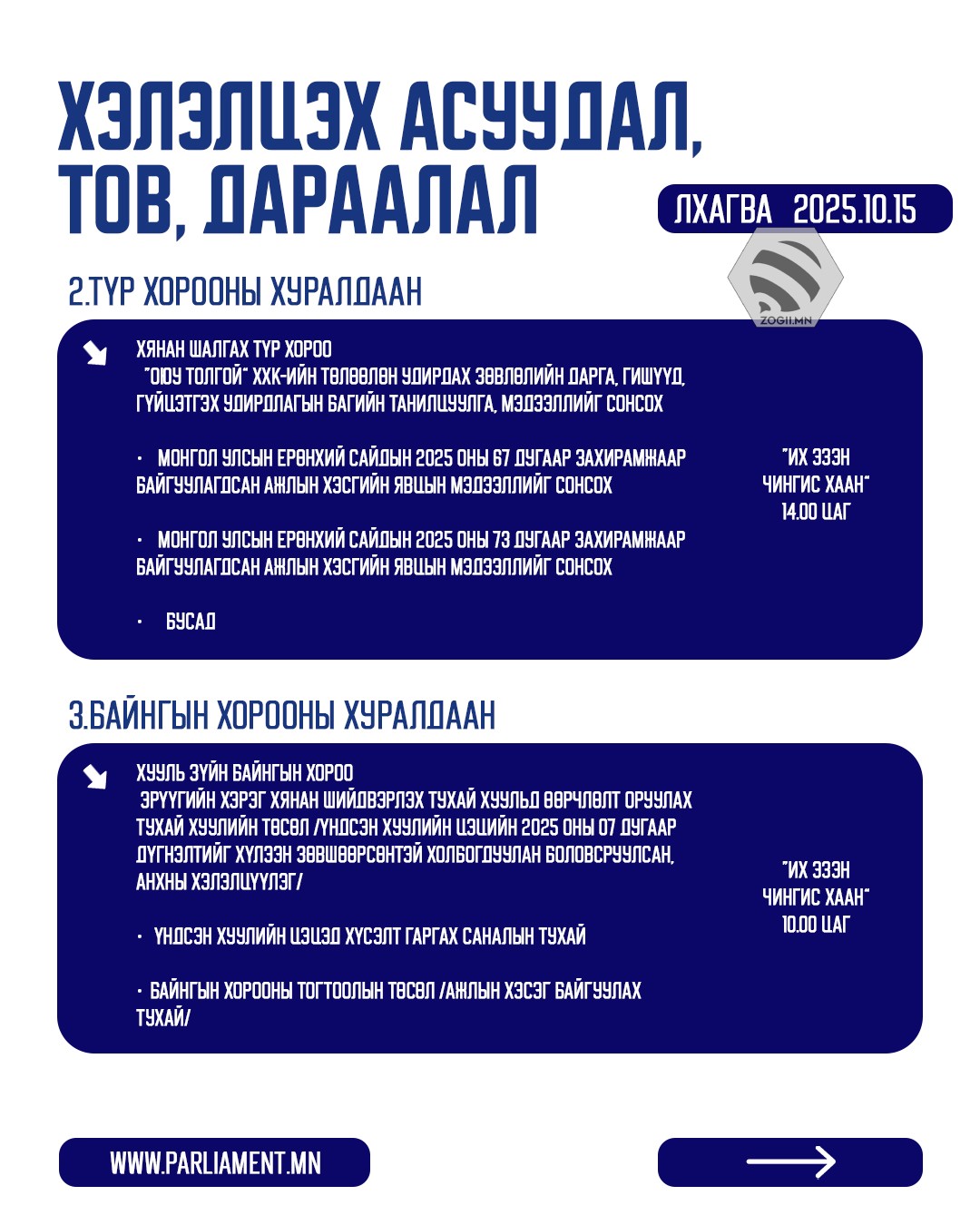 Улсын их хурлын 2025 оны намрын ээлжит чуулганы 2025 оны 10 дугаар сарын 13-наас 17-ны өдрийн хуралдаанаар хэлэлцэх асуудлын тов, дарааллыг танилцуулж байна.