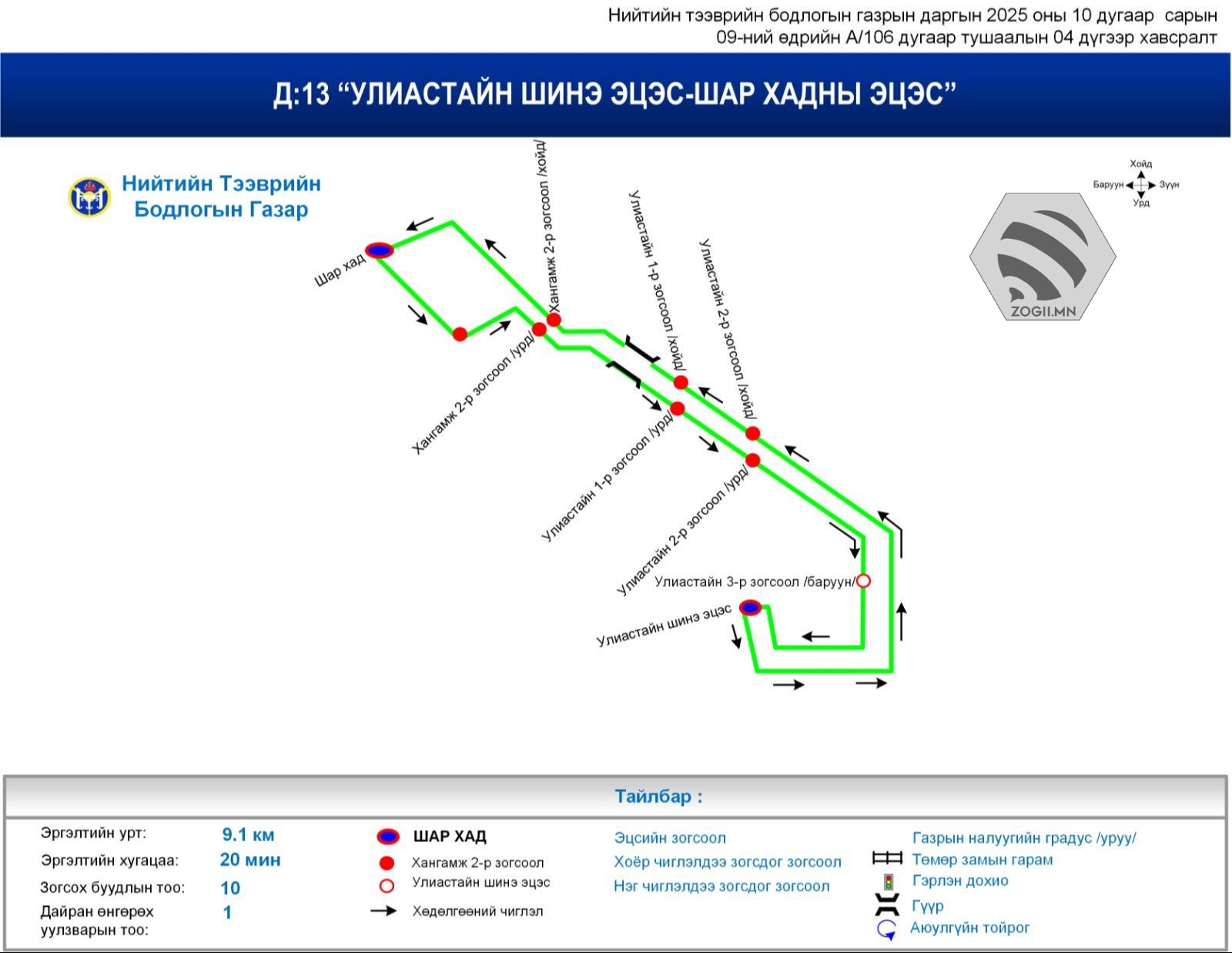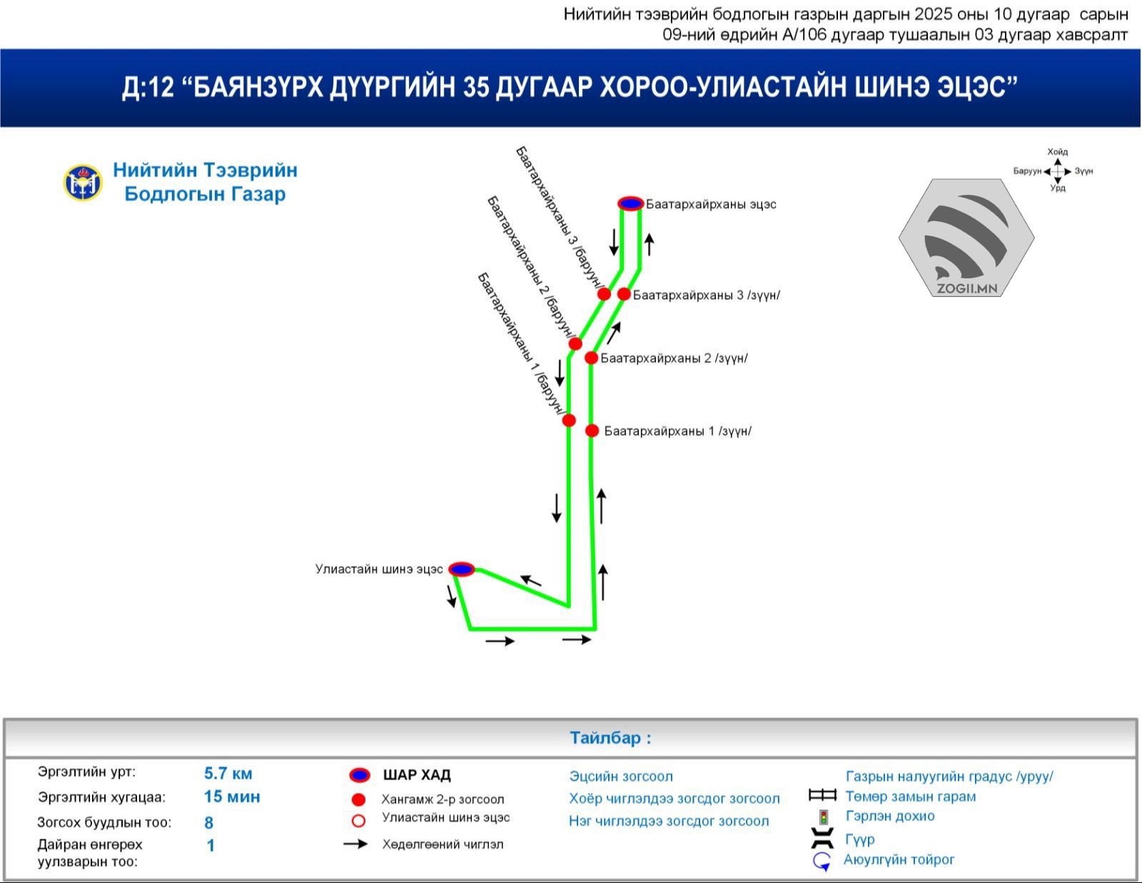 Баянзүрх дүүргийн 24 дүгээр хорооны иргэдийн зорчих эрэлтийг хангах зорилгоор Д:11 “Офицеруудын ордон-Эрдэнэтолгой-Цахлай-422 дугаар худаг” чиглэл, Баянзүрх дүүргийн 35 дугаар хорооны иргэдийн зорчих эрэлтийг хангах зорилгоор Д:12 "Баянзүрх дүүргийн 35 дугаар хороо-Улиастайн шинэ эцэс” чиглэл, Д:13 "Улиастайн шинэ эцэс-Шар хадны эцэс” чиглэлийг шинээр нээж байна.