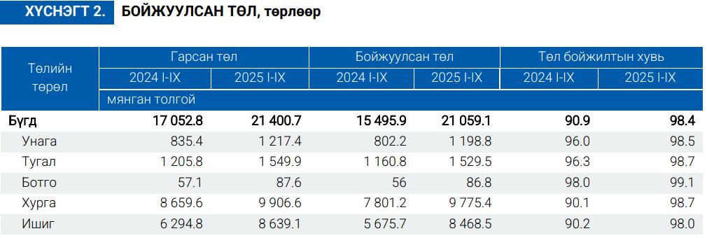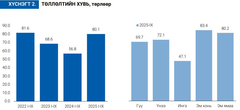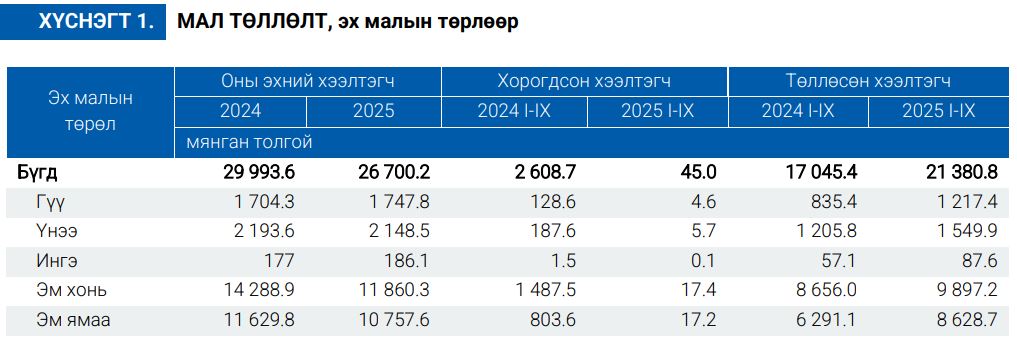 Улсын хэмжээнд 2024 оны эцэст тоологдсон төллөх насны нийт 26.7 сая хээлтэгч малын 21.4 сая (80.1%) нь 2025 оны эхний 9 сарын байдлаар төллөсөн байна.