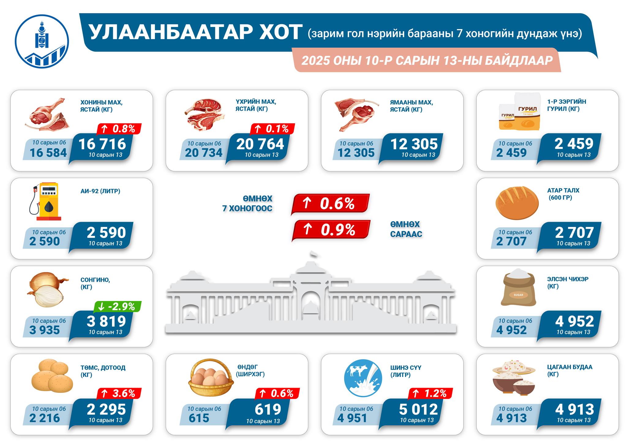 2025 оны 10 дугаар сарын 13-ны байдлаар аймгийн төвүүдэд зарагдаж байгаа гол нэрийн зарим хүнсний барааны дундаж үнэ танилцуулж байна.