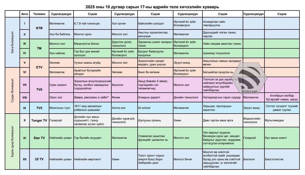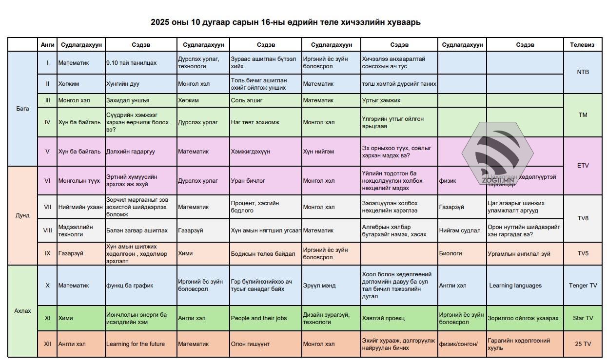 2025 оны 10 дугаар сарын 16,17-ны өдрүүдэд 9:00-17:00 цагийн хооронд дараах сувгуудаар теле хичээлийг хүлээн авч үзээрэй.