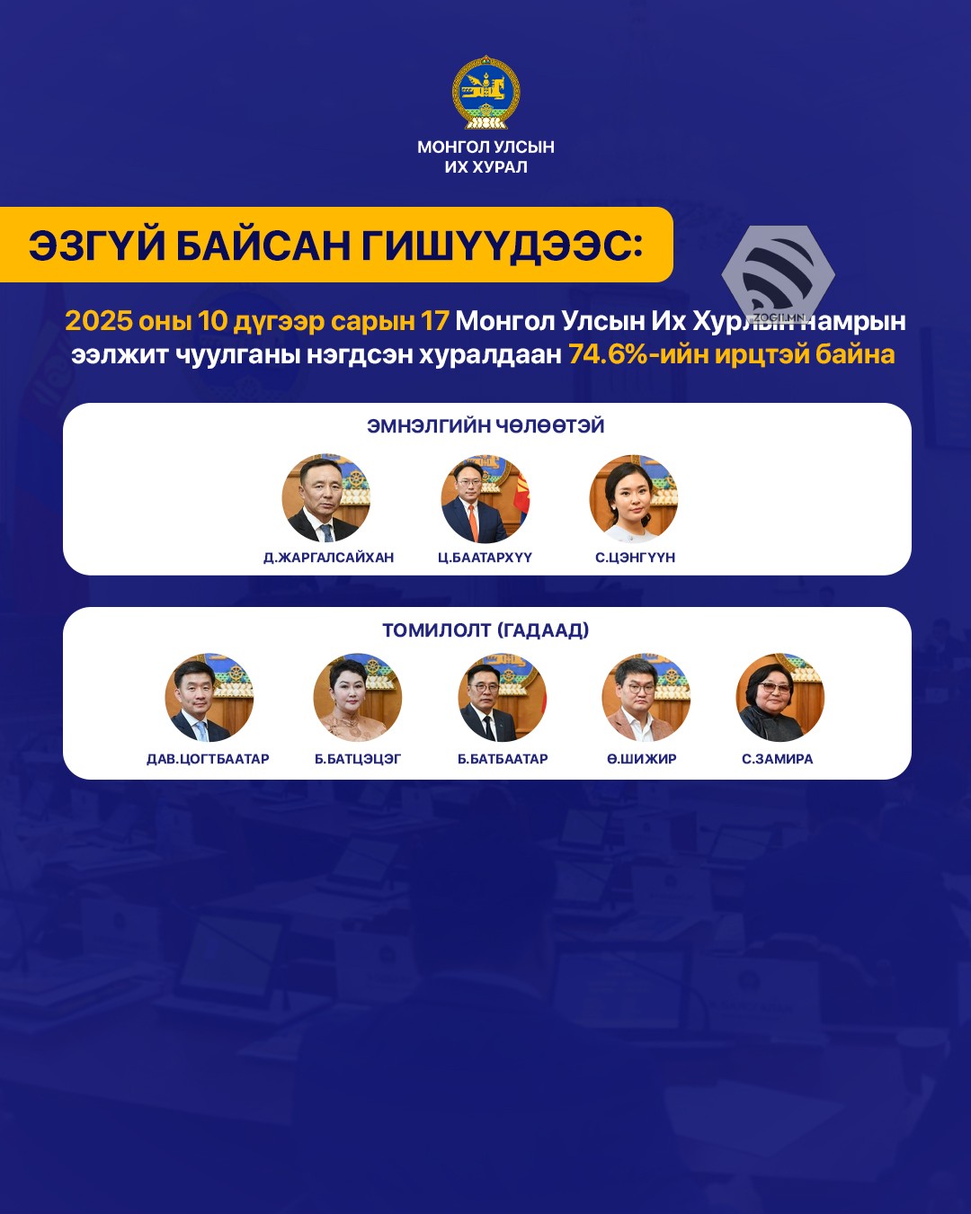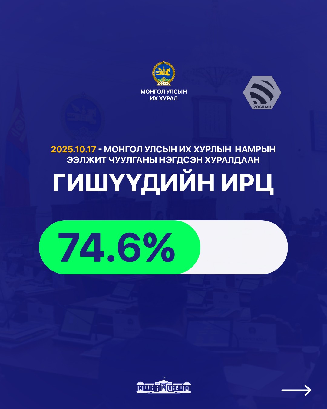 Монгол Улсын Их Хурлын 2025 оны намрын ээлжит чуулганы нэгдсэн хуралдааны 10 дугаар сарын 17-ны өдрийн ирцийн мэдээг танилцуулж байна.