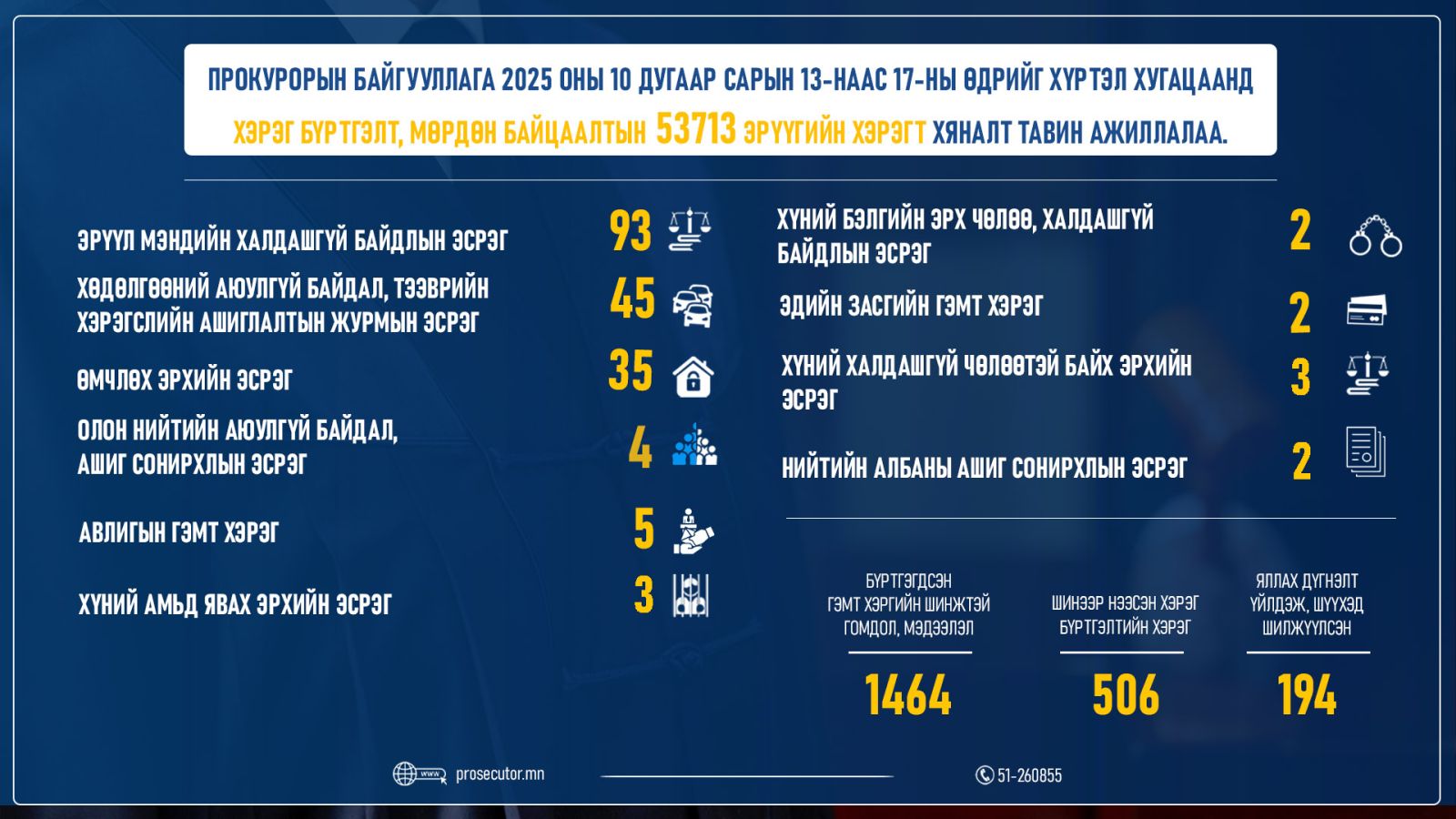 Прокурорын байгууллага 2025 оны 10 дугаар сарын 13-ны өдрөөс 17-ны өдрийг дуусталх хугацаанд хэрэг бүртгэлт, мөрдөн байцаалтын 53713 эрүүгийн хэрэгт хяналт тавин ажиллажээ.
