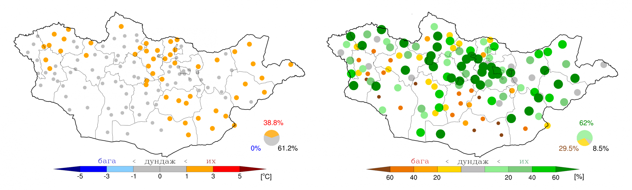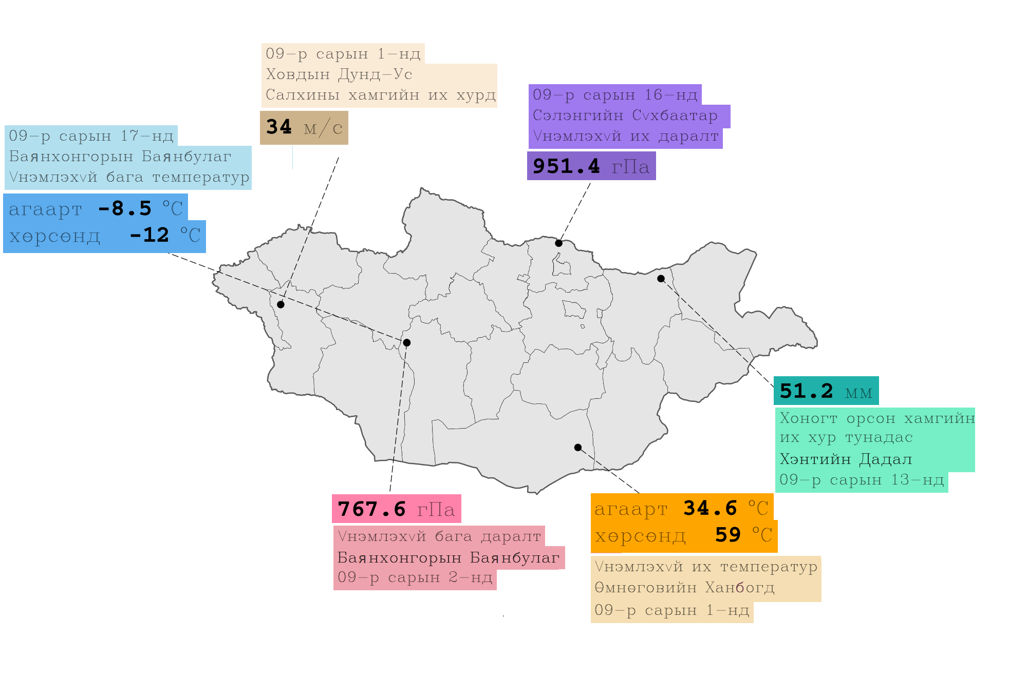 Харин агаарын температурын үнэмлэхүй их утга Өмнөговь аймгийн Ханбогд суманд 34.6°С, үнэмлэхүй бага утга Баянхонгор аймгийн Баянбулаг суманд -8.5°С хүрсэн бол хөрсний температурын үнэмлэхүй их утга Өмнөговь аймгийн Даланзадгадад 59°С, үнэмлэхүй бага утга Баянхонгор аймгийн Баянбулагт -12°С хүрч хүйтэрсэн байна.