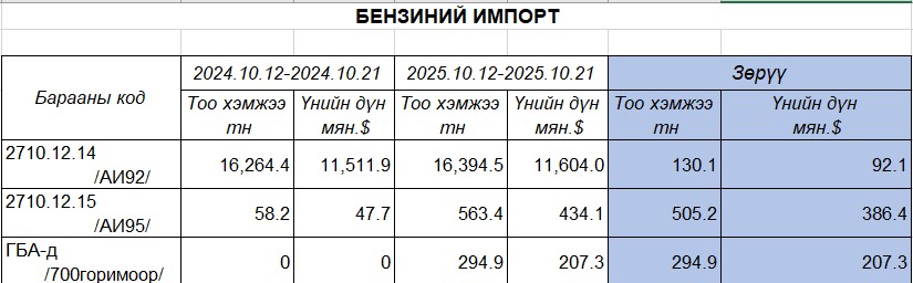 Дээрх хугацаанд буюу 2025 оны аравдугаар сарын 20-нд гаалийн баталгаат агуулахын гаалийн бүрдүүлэлтийн горимоор сонгон 294.9 тн, 207.3 мян.ам.долларын АИ92 бензинийг оруулсан байна.
