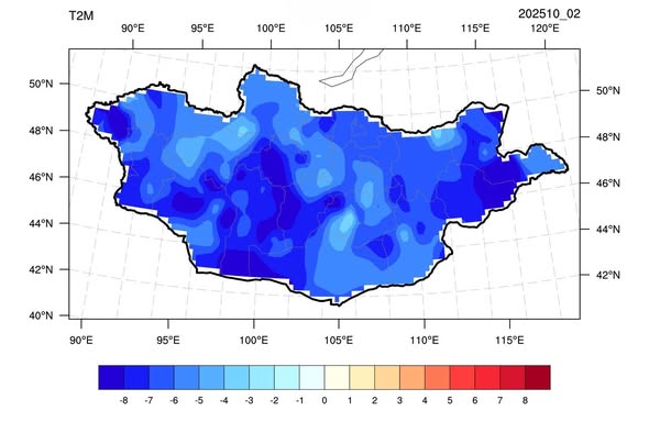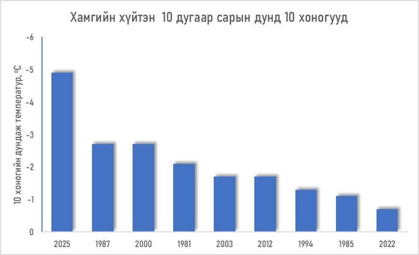 Монгол орны аравдугаар сарын дунд 10 хоногийн /11-20/ агаарын дундаж температур +2 градус дулаан байдаг бол энэ жил дундаж температур -6.9 градусаар хүйтэн буюу -4.9 градус байлаа. Энэ нь 1981 оноос хойших хамгийн хүйтэн 10 хоног болсон гэсэн үг юм.