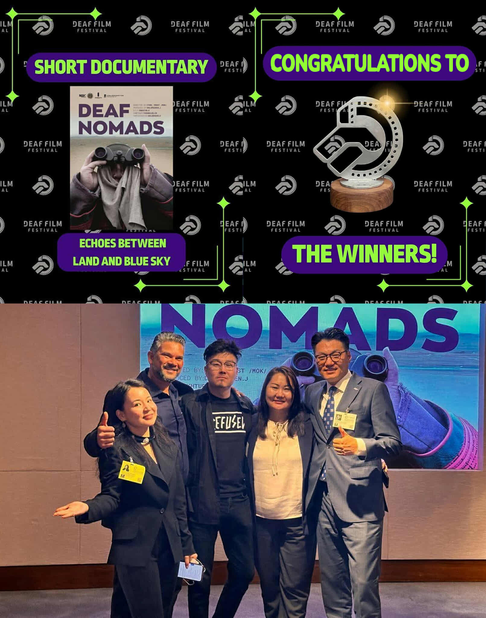 АНУ-ын Texas хотноо болсон Deaf film фестивалийн богино киноны төрөлд SDY Mongolia залуучуудын холбоо, Сонсголын бэрхшээлтэй иргэдийн соёлын төвтэй хамтран бүтээсэн Deaf nomads төсөл Тэргүүн байр эзэллээ.
