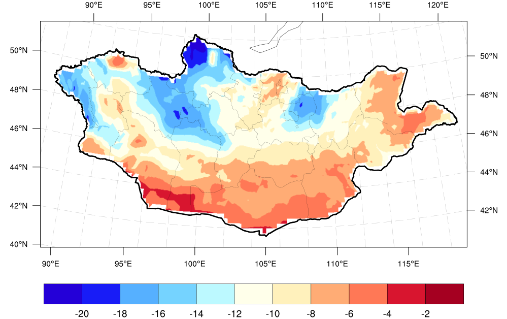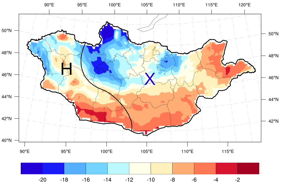 [Хөх – агаарын дундаж температур ОЖД-аас хүйтэн, улаан – агаарын дундаж температур ОЖД-аас дулаан,