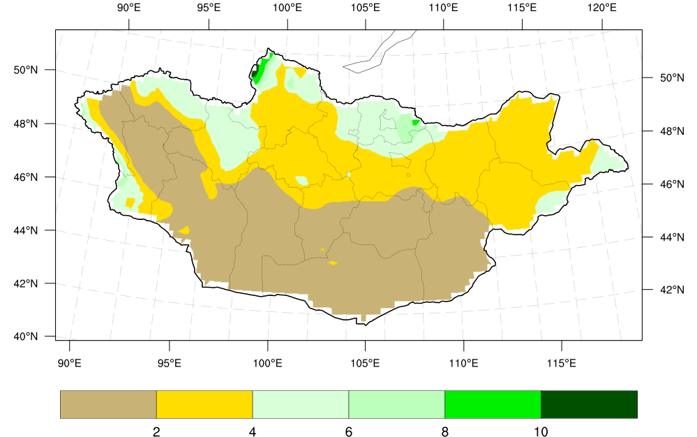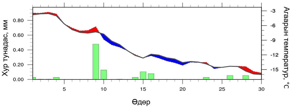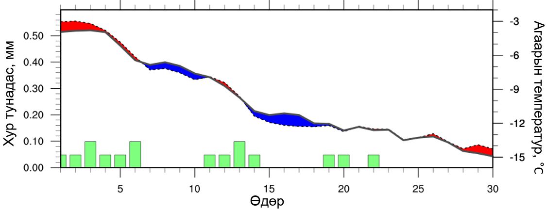 Говийн аймгуудын нутгаар. Энэ сард агаарын дундаж температур Өмнөговийн баруун хэсгээр ОЖД–ийн орчим, бусад нутгаар дунджаас бага зэрэг хүйтэн (Зураг 5), хур тунадас Өмнөговийн зүүн, Дорноговийн ихэнх хэсгээр ОЖД–аас бага, бусад нутгаар дунджийн орчим (Зураг 6) байх төлөвтэй байна. Агаарын температур, хур тунадасны явцыг (Зураг 10)–д харуулав. Нэгдүгээр арав хоногийн эхэн, гуравдугаар арав хоногийн сүүлч үеүдэд ихэнх нутгаар ОЖД-аас 1-3°С дулаан, харин хоёрдугаар арав хоногийн ихэнх хугацаанд ОЖД–аас 1-3°С хүйтэн, бусад хугацаанд дунджийн орчим байна. Хур тунадас хоёрдугаар арав хоногийн дунд үед зарим газраар цас орж, зарим үед салхи ширүүсэн шороон шуурга шуурч болзошгүй байна.