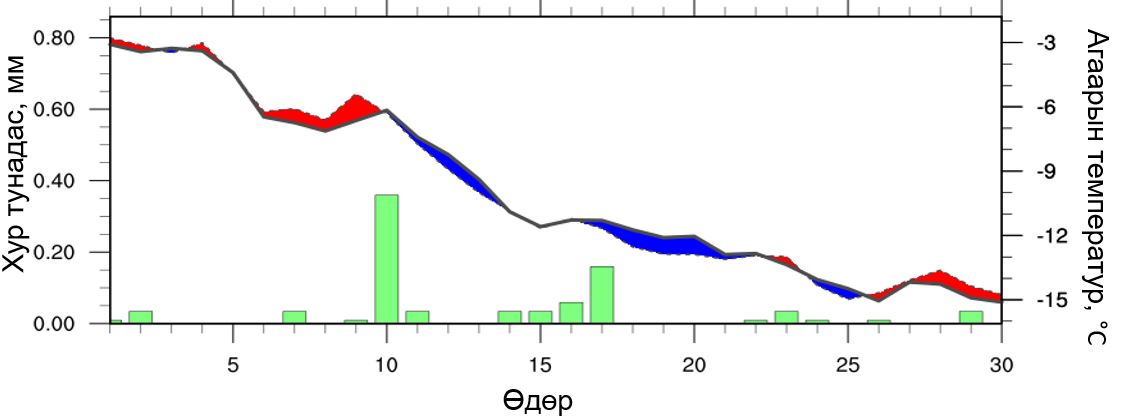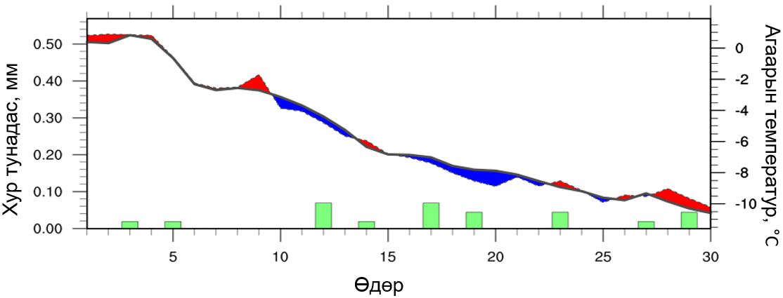 үргэлжилсэн хар зураас – агаарын дундаж температур, тасархай хар зураас – агаарын дундаж температурын ОЖД-аас хазайх хазайц, ногоон – хур тунадасны хэмжэээ]